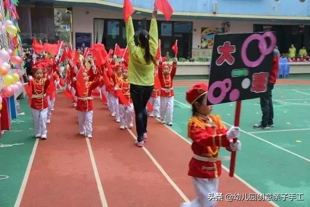 3、各班设计个性化口号,入场式时教师带领幼儿两路队摆手踏步走,经过升旗台前,在塑胶操场上绕操场一圈,边走边回应班级个性化口号和集体口号。