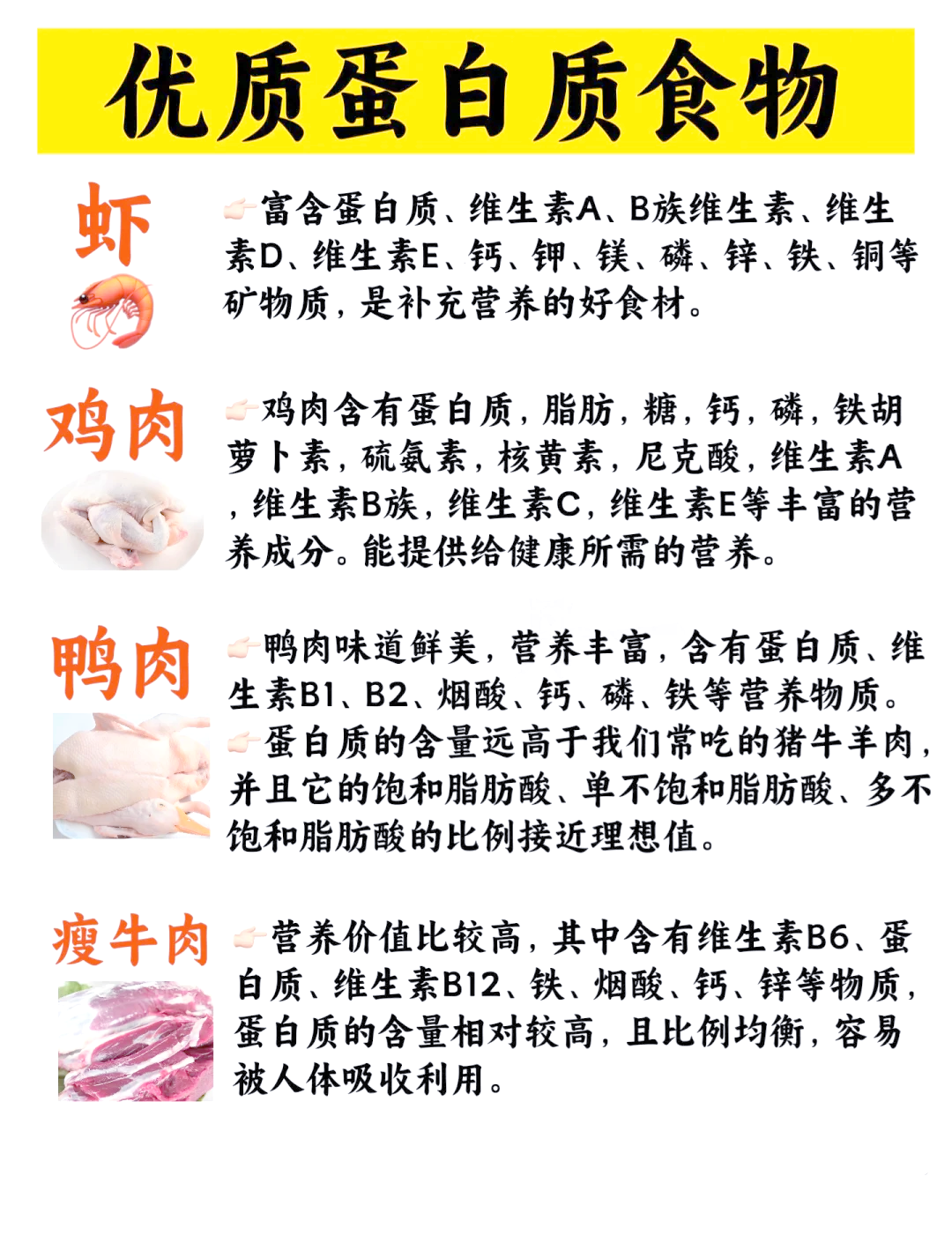 2、优质高蛋白食物主要包括以下几种1鱼肉尤其是深海鱼深海鱼肉脂肪含量低,蛋白质含量高,且富含不饱和脂肪酸如欧米伽3,有助于降低心脑血管疾病风险每周建议摄入5001000克,但痛风人群需减少海鲜类摄入,因嘌呤含量较高2瘦肉包括鸡胸肉猪里脊牛腱子等,脂肪含量低,蛋白质含量高。
