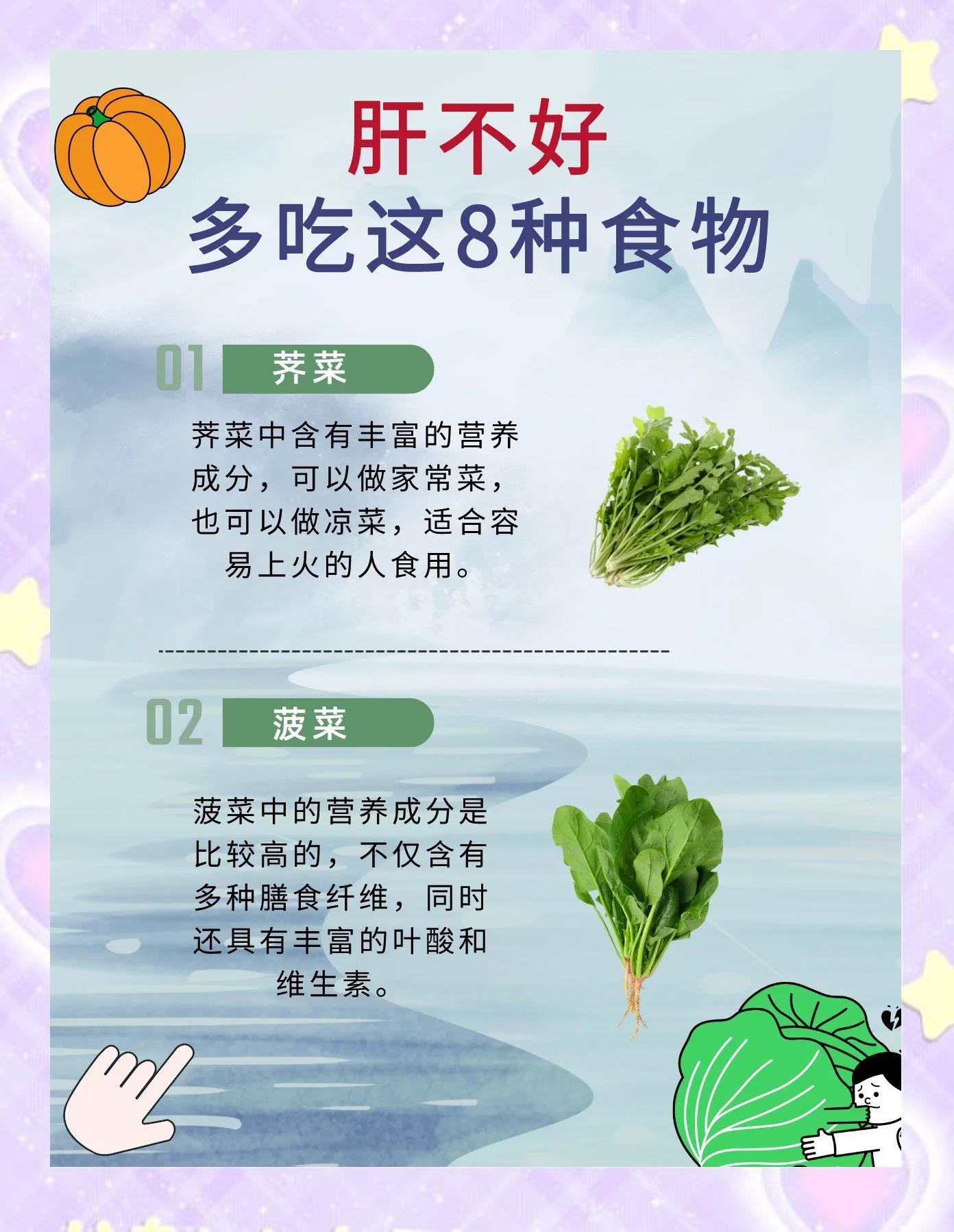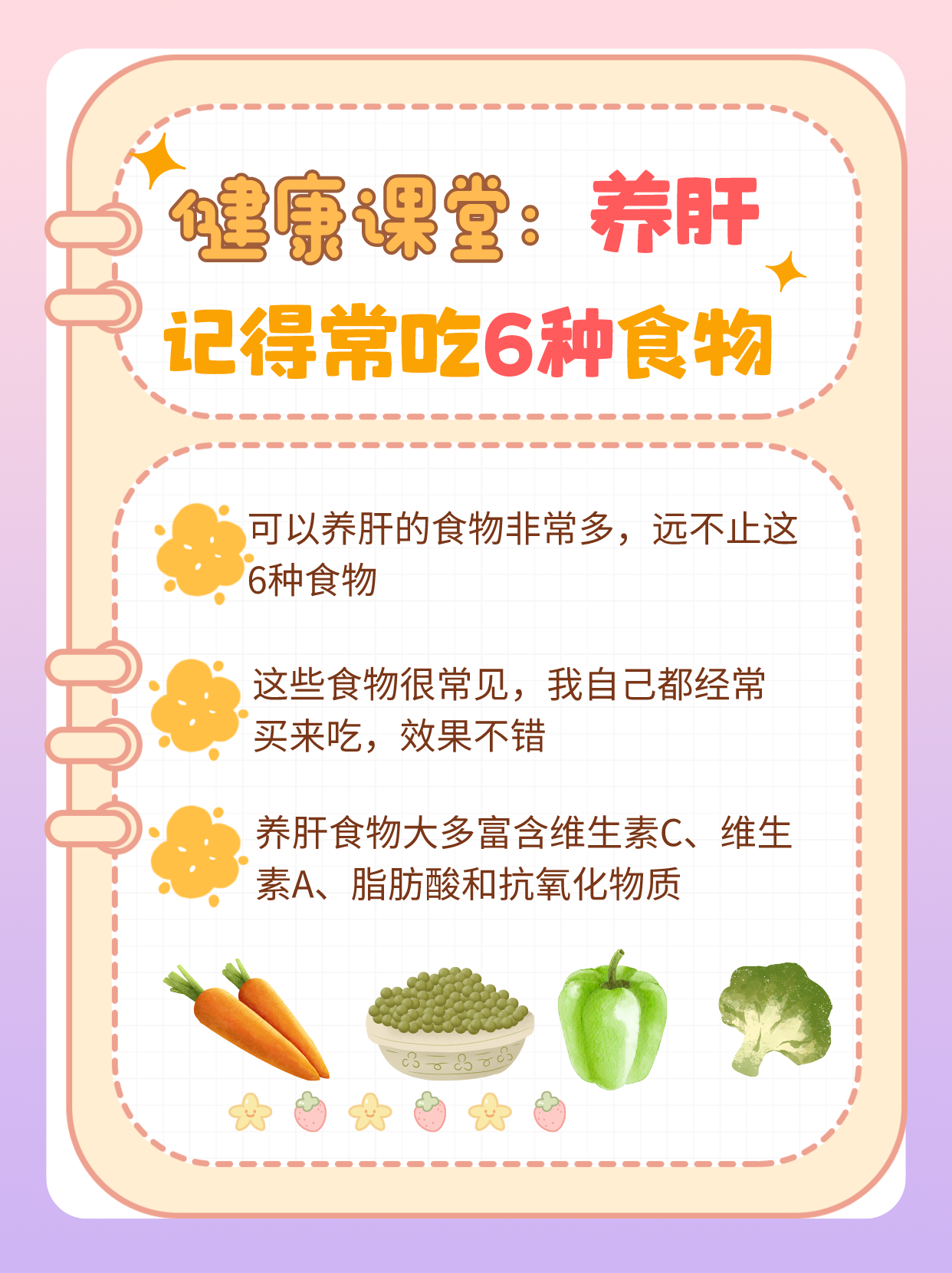 以下食物有助于护肝养肝1绿叶蔬菜绿叶蔬菜富含维生素如维生素CE矿物质及抗氧化剂如叶绿素类黄酮,能减轻肝脏代谢负担,促进肝细胞修复与再生推荐菠菜羽衣甘蓝生菜等,建议每日摄入200300克2富含蛋白质的食物蛋白质是肝脏修复的关键营养素优质蛋白来源包括鸡胸肉鱼类豆类。