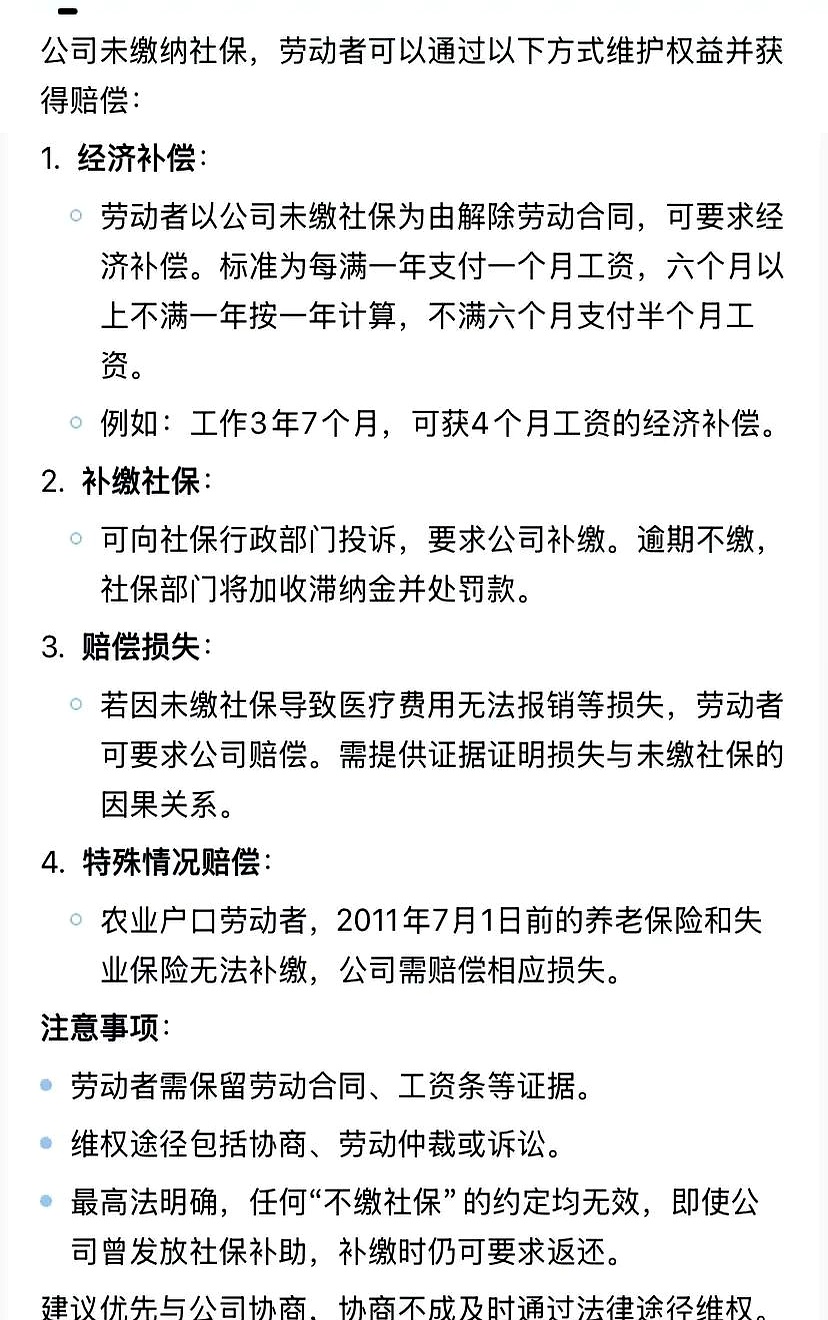 一经济补偿计算规则基础计算方式用人单位未依法缴纳社保,劳动者因此解除劳动合同的,用人单位需支付经济补偿补偿标准按劳动者在本单位的工作年限确定,每满一年支付一个月工资六个月以上不满一年的,按一年计算不满六个月的,支付半个月工资月工资定义月工资指劳动者在劳动合同解除或终止前;不交社保可以要求赔偿具体如下依据劳动合同法可获经济补偿根据劳动合同法规定,单位未依法为员工缴纳社会保险费的,员工有权解除劳动合同,并且可以要求单位支付经济补偿经济补偿的标准按照员工在本单位工作的年限计算,每满一年支付一个月工资的标准向员工支付六个月以上不满一年的,按一。