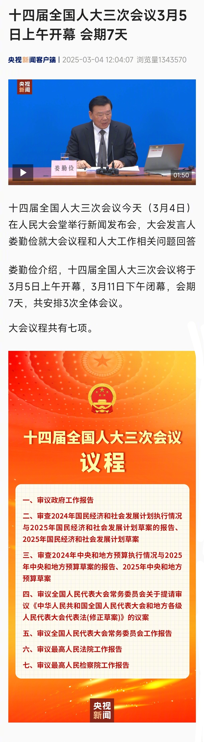 10、例如十四届全国人大二次会议于2024年3月5日开幕,3月13日闭幕会议期间代表们会审议政府工作报告审查国民经济和社会发展计划等重要议程 2 中国人民政治协商会议一般比全国人民代表大会早1 2天开幕,会期也在一周左右如全国政协十四届二次会议于2024年3月4日开幕 ,3月10日下午闭幕会议期间政协委员们会围绕国家重大问题和群众关心的热点难点问题积极建言。