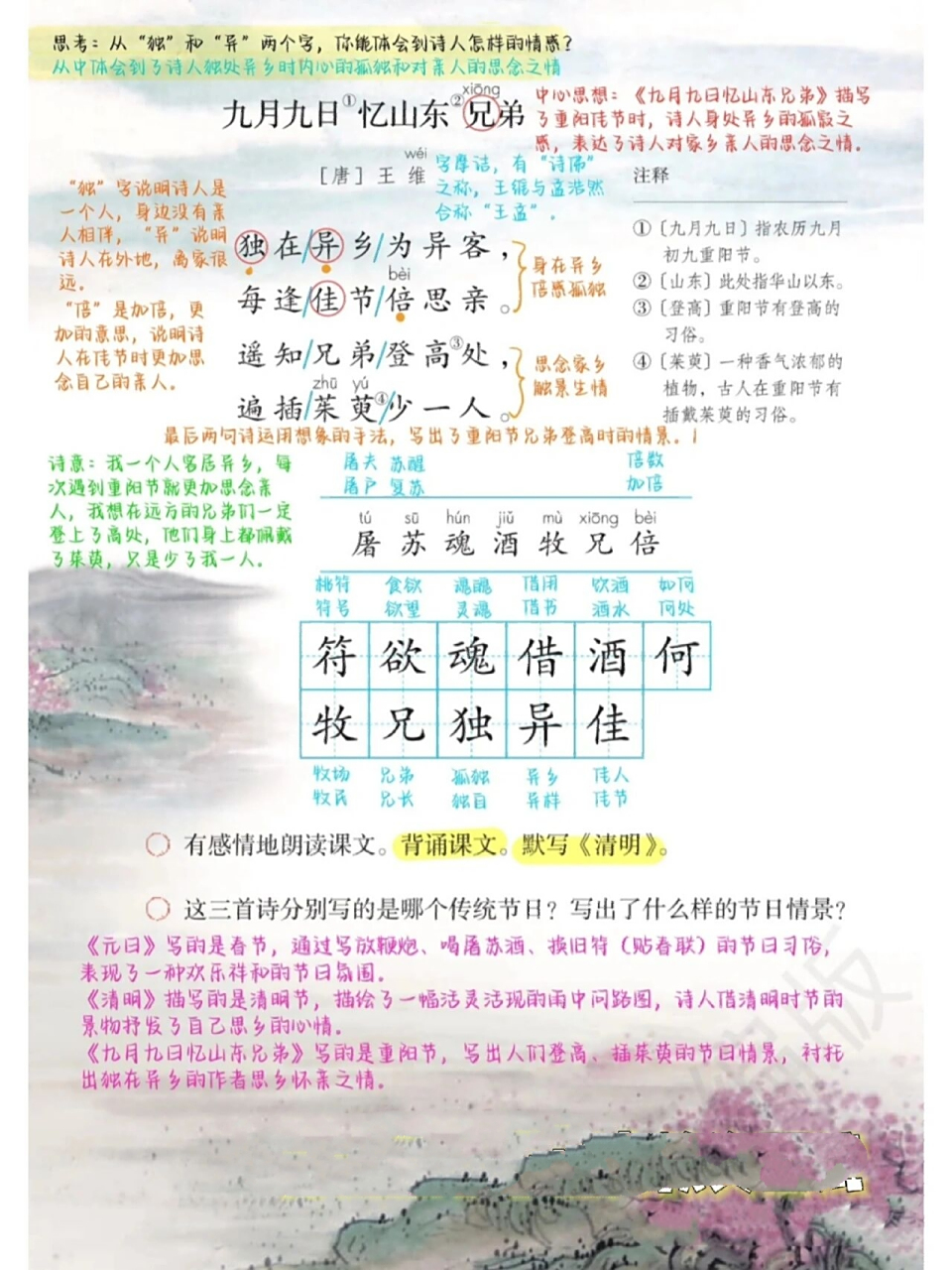 篇一小学三年级语文九月九日忆山东兄弟知识点 原文九月九日忆山东兄弟 唐代王维 独在异乡为异客,每逢佳节倍思亲遥知兄弟登高处,遍插茱萸少一人译文一个人独自在他乡作客,每逢节日加倍思念远方的亲人遥想兄弟们今日登高望远时,头上插满茱萸只少我一人注释九月九日即重阳节。