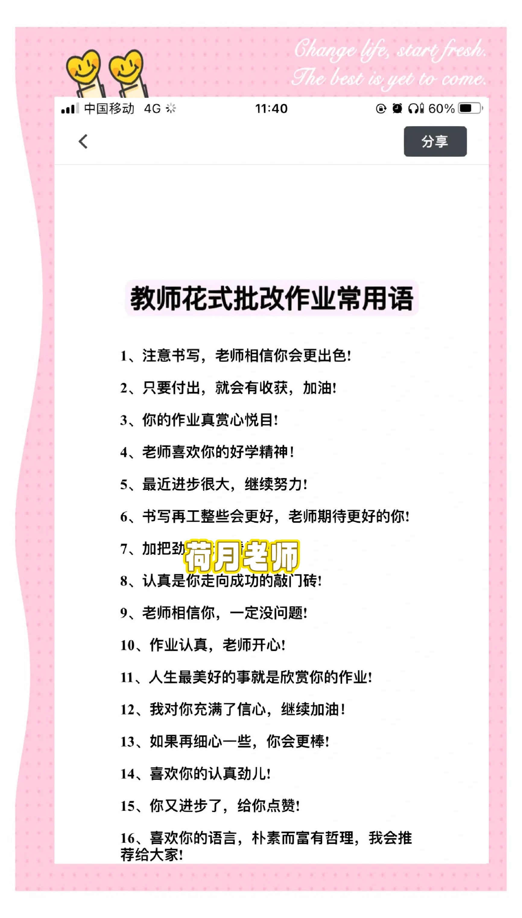 1老师,您的教诲如春风拂面,让我受益匪浅 2您的耐心和细心让我感受到了您对教育的热爱和敬业 3您的课堂生动有趣,让我对语文产生了浓厚的兴趣 4您的严谨治学态度让我明白了学习需要认真对待 5您的关心和帮助让我感受到了温暖和鼓励 6您的智慧和才华让我对您充满了敬意和钦佩 7您。