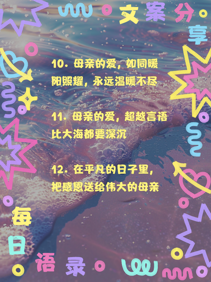 7母爱是伟大的,也是无私的,它沉浸于万物之中,充盈于天地之间8母亲的心是一个深渊,在它的最深处你总会得到宽恕9母爱像火红的太阳,母爱像黑夜里的油灯,母爱像冬天里的毛衣,母爱更像山间的溪水,一点一滴的细流汇成潺潺的溪流,一点一滴的关怀汇成浓浓的母爱10母爱就像一首田园。