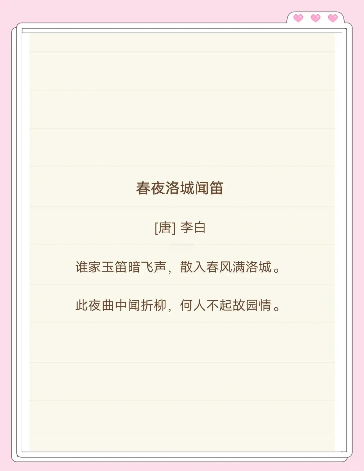 给人以遐想和深刻的印象3 春夜洛城闻笛原文如下谁家玉笛暗飞声,散入春风满洛城此夜曲中闻折柳,何人不起故园情4 白话译文大意是不知哪家的玉笛,悄悄地吹奏出悠扬的旋律,随着春风在洛阳城中飘扬在这个夜晚,听到折杨柳这首曲子,谁不会被激发起对故乡的深深思念呢。