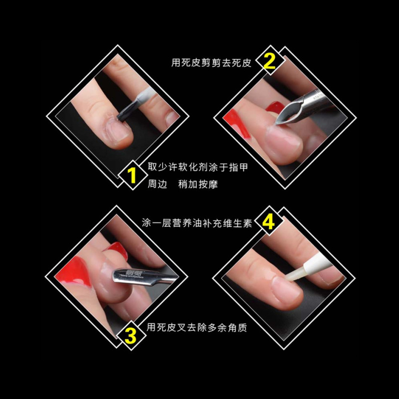 1 清洁双手首先,用温和的洗手液彻底清洁双手,去除指甲周围的污垢和油脂2 打磨指甲使用指甲磨砂棒或指甲砂纸轻轻打磨指甲,使其呈现均匀的形状3 涂抹软化剂将适量的美甲软化剂均匀涂抹在指甲边缘的硬皮和死皮上可以使用棉花棒或刷子轻轻按摩,帮助软化剂更好地渗透4 等待软化等待。