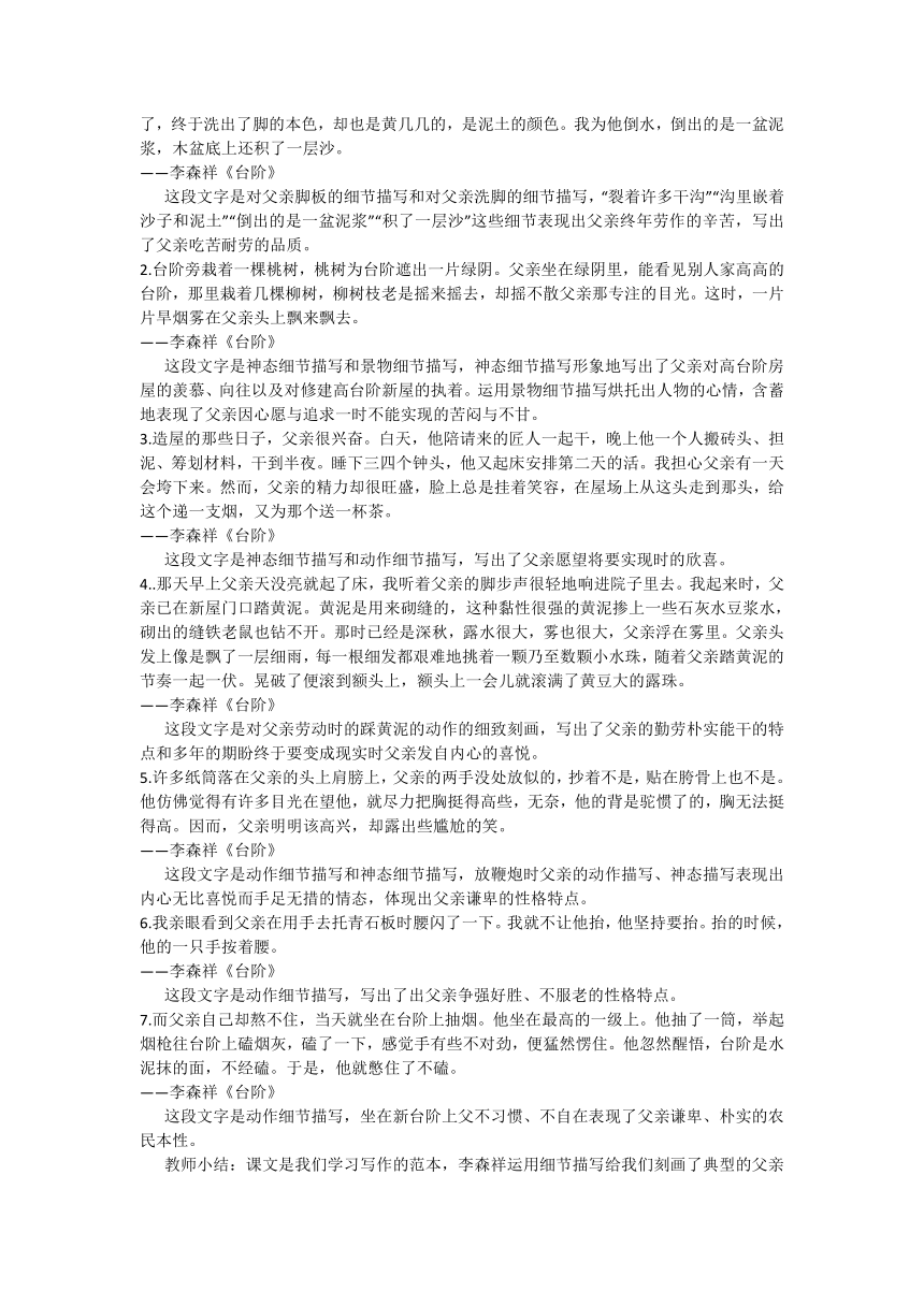 2学习通过关键语句理解故事内容,体会人物感情的方法重点概括本文的主要内容 难点学习通过细节描写刻画人物形象的写法教学过程一导入新课 二了解作者及写作背景 三整体感知 请同学们快速浏览课文,用自己的语言概括本文的主要内容明确我们家的旧台阶低,父亲准备造新台阶,开始造新台阶;通过描写父亲建造有九级台阶新屋的过程,刻画了人物的吃苦耐劳坚忍不拔和自立自强的形象。