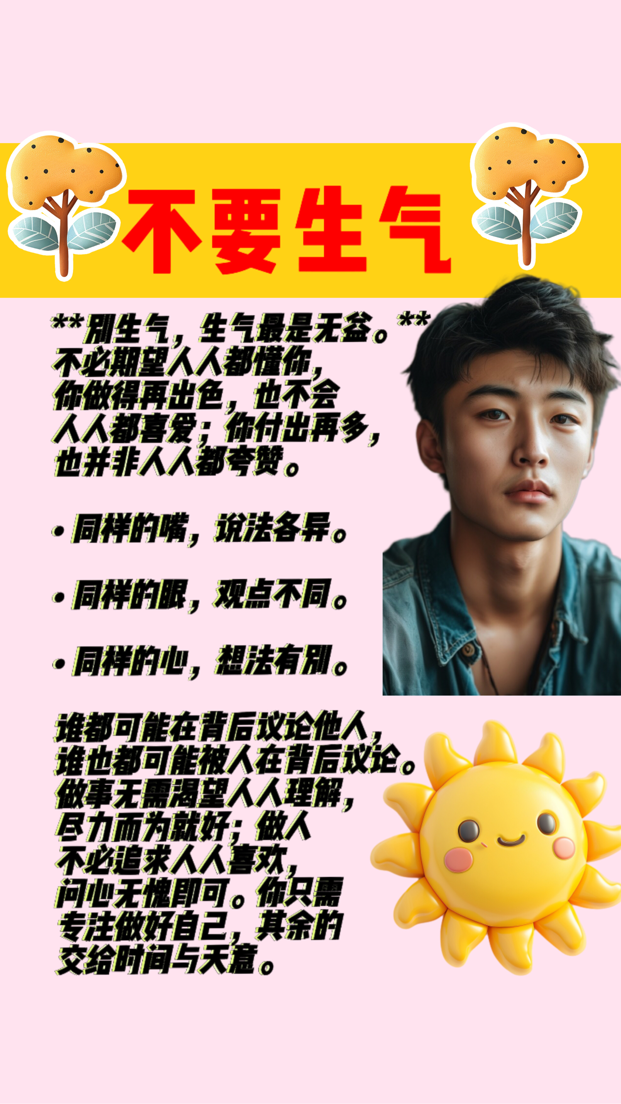 “莫生气”类句子本质是化解情绪的生活智慧,适合压力下想调整心态的人群 这类句子常见于中年以上群体3060岁为主,不分性别,尤其工作家庭双重压力者常主动接触例如基层职员个体商户全职主妇等,多因现实矛盾如经济压力人际摩擦需要心理疏导以下是高频句子与对应应用场景 一经典。