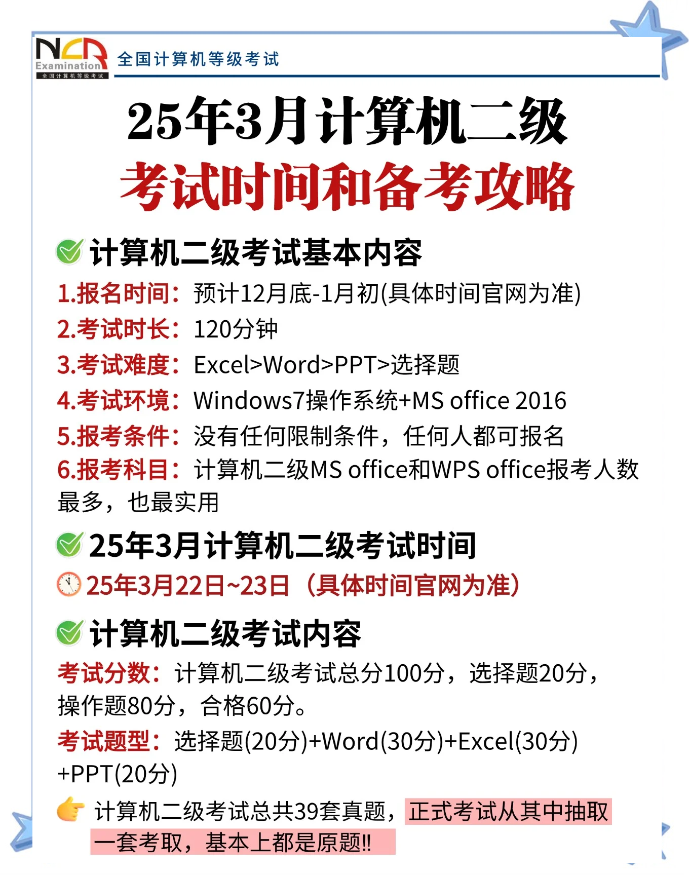 2、计算机二级考试在每年的3月和9月进行考试较为合适,但具体时间需根据当年的报名和考试安排来确定以下是对计算机二级考试报考时间的详细解析和建议一考试时间 全国计算机等级考试NCRE二级考试每年举行两次,通常安排在3月和9月考生需要密切关注教育部考试中心或相关考试机构的通知,以获取具体的考试;大学计算机二级考试的时间因年份和地区而异,但通常会安排在每年的3月9月以及部分地区的12月进行以下是关于大学计算机二级考试时间的具体说明3月份考试每年3月份,通常会安排一次全国计算机等级考试,其中包括计算机二级的考试具体时间可能会因年份而有所调整,但大致都在3月的中下旬9月份考试;2025年9月全国计算机二级考试时间为9月20日至22日,各省具体安排不同其中,北京海南云南山东青海上海的考试时间为9月20日 21日湖北广西河北内蒙古吉林江西陕西天津四川福建广东新疆山西贵州甘肃重庆辽宁湖南河南浙江安徽的考试时间为9月20日;全国计算机二级考试一般安排在每年的3月6月9月和12月,具体时间由各地教育考试机构自行确定,通常在当月下旬进行以下是关于考试时间的详细说明全年考试时间安排全国计算机二级考试为了满足广大考生的需求,每年会进行多次考试这些考试被均匀地安排在每年的3月6月9月和12月,以便考生可以根据;计算机二级考试时间通常为每年的3月6月9月12月以下是关于计算机二级考试的一些详细信息和说明一考试时间 计算机二级考试由教育部考试中心主办,每年在3月6月9月12月举行,具体时间可能会根据当年的实际情况有所调整,考生需密切关注教育部考试中心或相关考试机构的通知二考试形式 全。