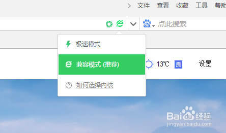 怎么看360浏览器的极速模式看360浏览器的极速模式的方法如下 1打开电脑进入系统后,双击360安全浏览器进入360页面,进入浏览器界面后,打开任意网页,在顶部的网址后方,点击图标 2点击图标后,可以看到浏览器里面会显示出两种模式,一种为兼容模式,另一种则为极速模式点击选中极速模式3选中后。