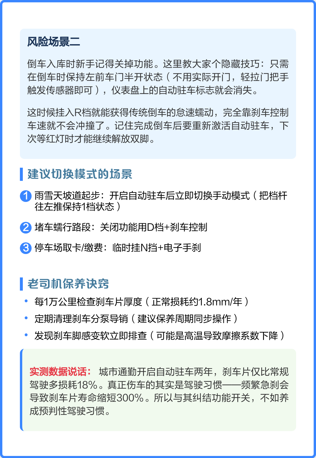 值得注意的是,持续开启自动驻车可能会对车辆的刹车系统产生不必要的负担,甚至可能引发刹车失灵等安全隐患因此,出于安全考虑,我们并不建议驾驶者将这一功能长时间开启自动驻车功能的主要目的是在车辆静止时保持制动状态,防止车辆滑动或意外移动然而,频繁使用这一功能会导致刹车系统过度磨损,从而缩短。