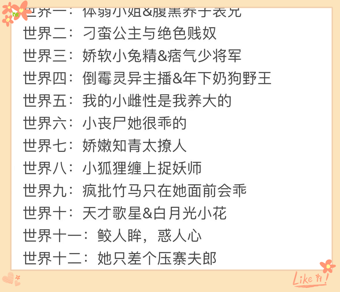 以下是几本涉及女主和系统在一起情节的快穿文推荐1 女配翻身攻略简介女主在系统的帮助下,穿越到各个世界,改写原本悲惨的女配命运在与系统的互动中,两人逐渐建立起深厚的友谊,甚至萌生出超越友谊的情感2 最佳女配简介女主原本只是一个普通的配角,但在系统的辅助下,她开始在各;快穿之夺爱游戏文案校园小清新文豪门女配逆袭文黑道总裁文嫡女重生复仇文古言np文末世女主文修仙玛丽苏文现实世界 各系少女角色扮演柔弱白莲花冷艳傲娇女反差萌温婉淑女甜美萝莉弱娇萌腹黑女天然呆精分少女一面神女,一面妖女女王回归 各系男色。
