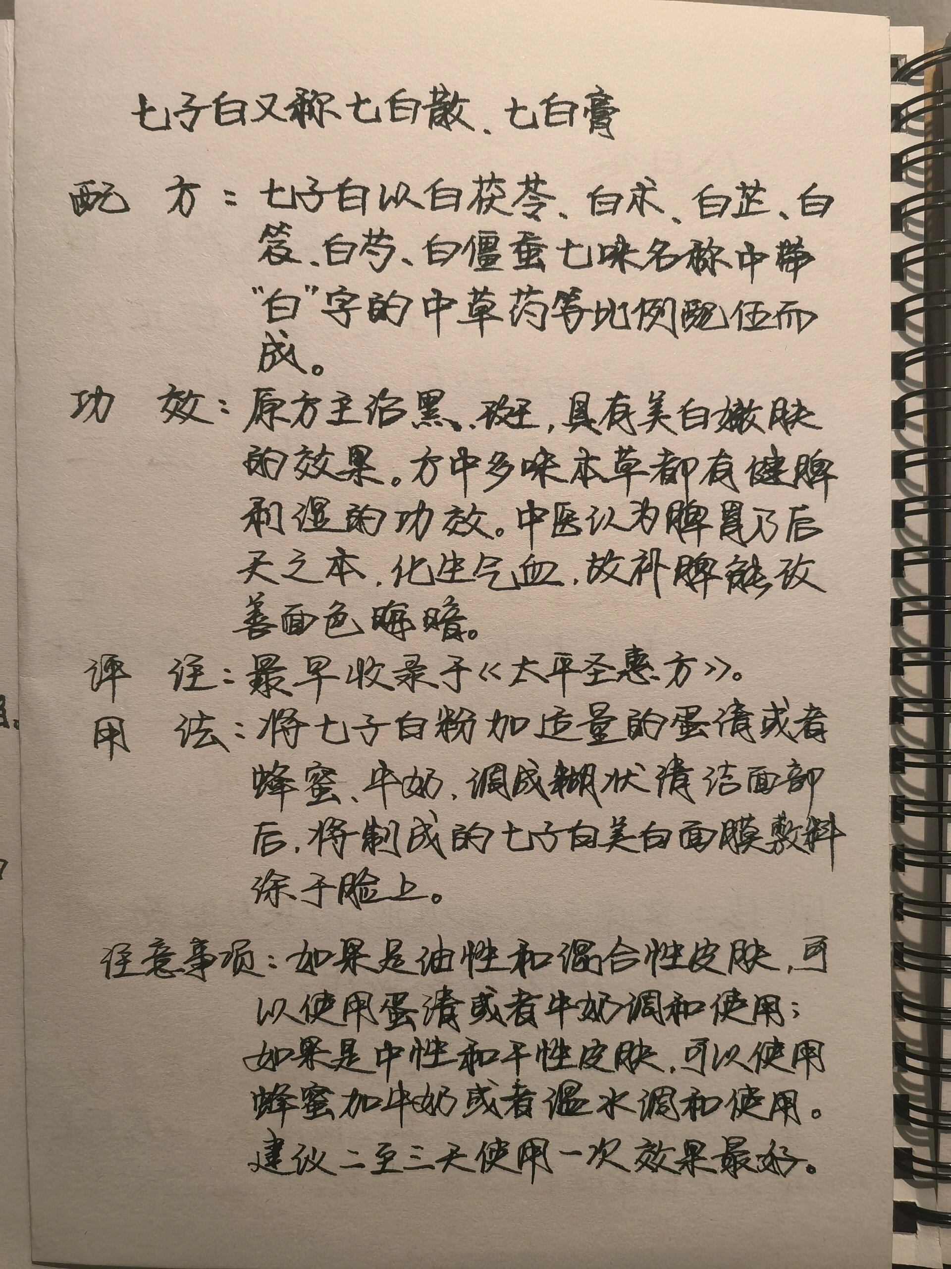 七白饮是一种基于七白散的中医食疗方法,它具有养血益气清热解毒的功效七白散是一种治疗皮肤病的传统中药方剂,由白芍白芨白术白蔹白僵蚕白茯苓和甘草七种草药组成,每种草药都具有独特的作用白芍用于养血调经清热解毒白芨用于润肺止咳消肿止痛白术用于健脾益气燥湿利水白蔹用于;中药里的“七白”有两种说法一种指白芷白蔹野红薯白术白茯苓白芨白芍白附子,这是美容古方,可做七白粉和七白膏一般配方是白茯苓10g,其它各5g,也能简化为四白散白芷白术白茯苓白芍,功效相差不大另一种说法是白芍白芷白茯苓白菊花白及白僵蚕白鲜皮。