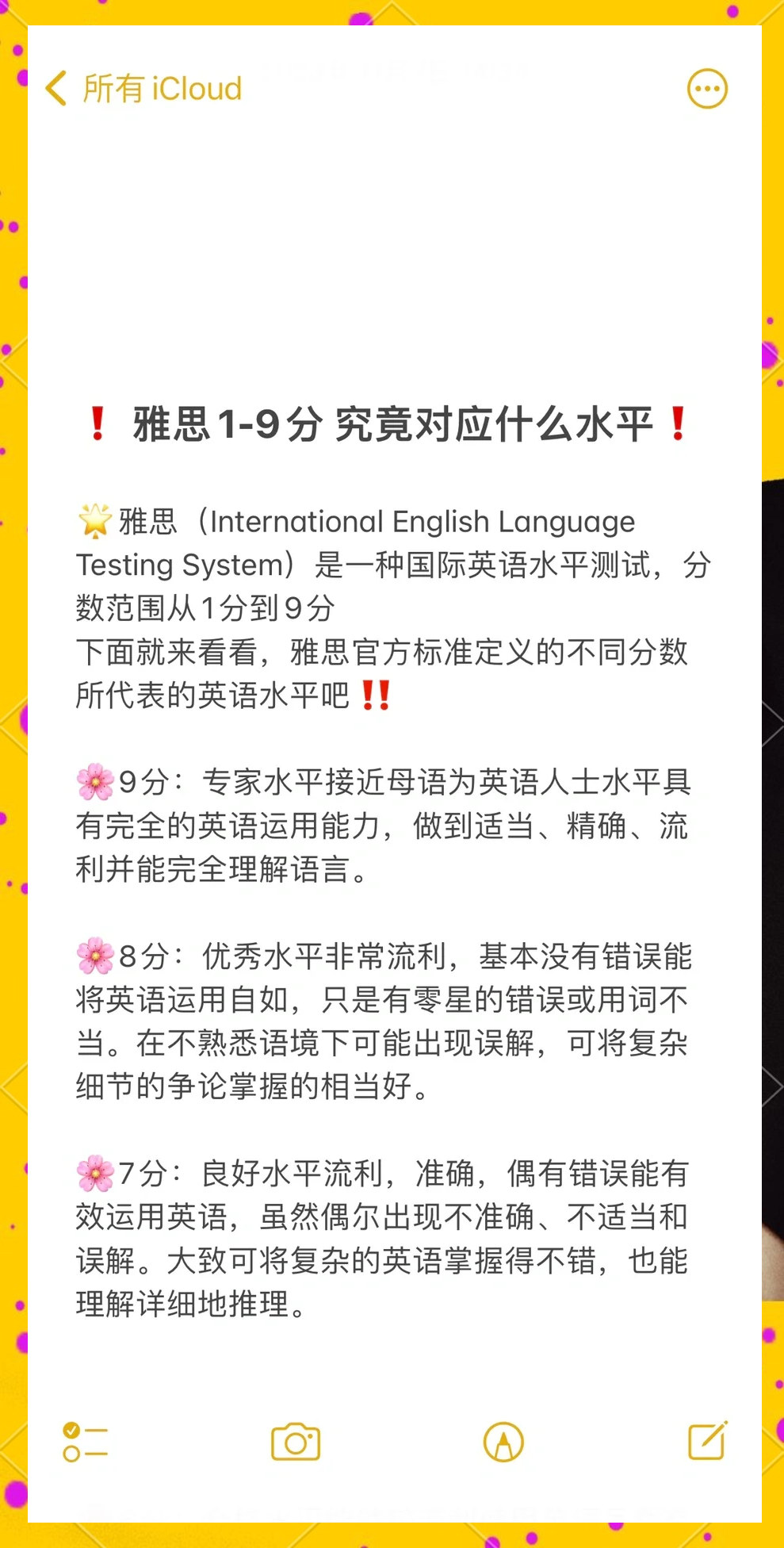 5、雅思6分相当于英语六级450分左右的水平,属于能够进行普通英语交流的水平以下是关于雅思6分水平的详细解释一语言能力 雅思6分的考生在英语听说读写四个方面都具备一定的能力他们能够较为流畅地进行日常对话,理解并回应生活中的各种场景和问题在听力方面,能够抓住对话或独白中的主要信息和细节;雅思成绩6分属于中等英语水平这个分数表明考生在英语交流阅读写作等方面具有一定的能力具体来说,拥有雅思6分的人通常能够听懂基本谈话,读懂简单文章,写出日常表达和简单论述,并能够进行基本的口头表达这一水平相当于国内英语四级考试650分或英语六级考试550分左右,也相当于国内英语专业6级以上但;雅思6分相当于国内英语专业6级以上,但低于英语专业8级的水平这意味着考生的英语水平在国内属于中上水平,但尚未达到英语专业的顶尖水平分数差距与难度雅思成绩的评定是阶梯型的,每差1分代表的英语水平都有很大的差距从6分到7分,考生需要付出更多的努力来提升英语水平,因为7分是一个更高的;雅思6分代表合格水平,相当于国内英语专业6级以上,但低于8级剑桥考试委员会定义为“较为有效运用英语”,虽然存在不准确不恰当和误解,但在熟悉语境下能理解复杂的英语各国高校一般要求6到7分,故如欲申请优质高校,至少需考7分雅思总分9分,四个单项分数与总分构成9分为3942题,85分。
