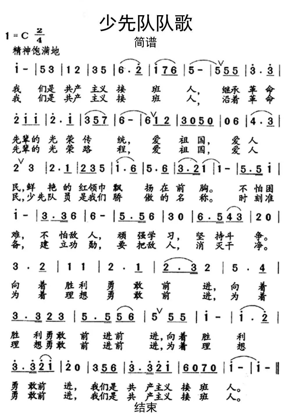4、中国少年先锋队队歌是中国少年先锋队的队歌,也是中国儿童歌曲的经典之一该歌曲于1950年代初期诞生,原唱版简谱为C大调以下是原唱版简谱C D E F G G G G G G G G G 我们是共产主义接班人,从小立志要为人民服务G A G F E。