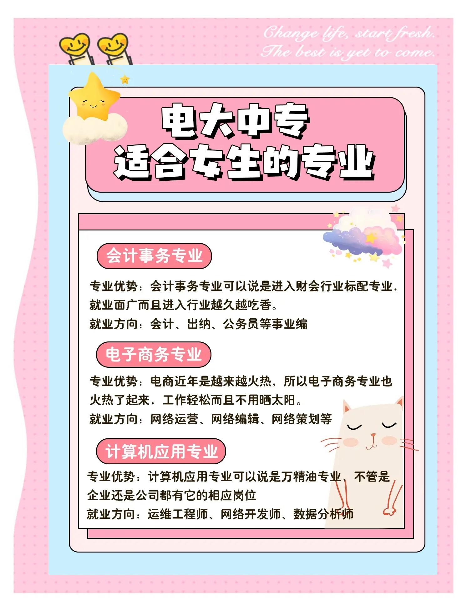 女生报考中专,选择哪个专业更好,主要取决于个人兴趣职业规划以及各科成绩以下是一些建议,供不同兴趣和学科倾向的女生参考对于文科倾向的女生财会适合对经济财务有兴趣的女生,未来就业前景广阔,可从事会计出纳等工作外国语适合语言学习能力强对国际交流感兴趣的女生,未来可从事翻译。