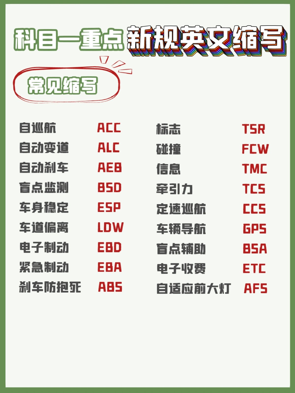 E开头的,表示“电子”如,ESP电子车身稳定系统,EBD电子制动力分配系统W结尾的,表示“预警”,如,FCW前方防碰撞预警,LDW车道偏离预警A结尾的,表示“辅助”,如,BSA盲点辅助,EBA紧急制动辅助科目一英文缩写解读 “交通”必定是T开头,如,TMC实时交通信息。