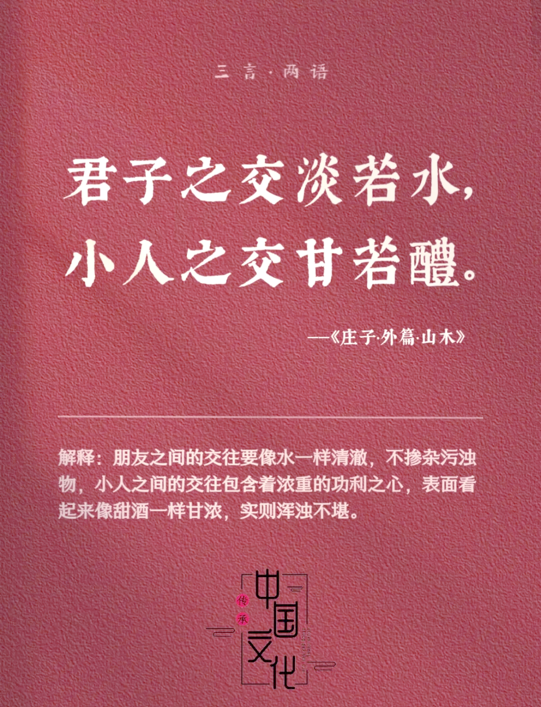 2、君子之交淡如水 小人之交甘若醴的读音jūn zǐ zhī jiāo dàn rú shuǐ xiǎo rén zhī jiāo gān ruò lǐ 译文看到好多人都解读太字面 这是出自庄子·山木,说人对利益不要有执念 这句话的来历是,孔子问好友桑雽说,我在鲁国被驱逐,在宋国被羞辱,在卫国被扫地出门,在;君子之交淡如水,小人之交甘若醴读作jūn zǐ zhī jiāo dàn rú shuǐ,xiǎo rén zhī jiāo gān ruò lǐ;读音为jūn zǐ zhī jiāo dàn rú shuǐ,xiǎo rén zhī jiāo gān ruò lǐ字词释义“君子”在传统文化中代表具有高尚道德和人格的人,最初是贵族和执政者的代称,后经孔子改造赋予其优秀道德意蕴“小人”则与君子相对,常指道德品质低下为利益所驱使的人“醴”指甜酒,在这里用来;读音jūn zǐ zhī jiāo dàn rú shuǐ,xiǎo rén zhī jiāo gān ruò lǐ“君子之交淡如水,小人之交甘若醴”选自战国庄周的庄子·山木意思是君子的友谊淡得像清水一样,小人的交情甜得像甜酒一样君子之间的交情,并不因利益驱使而怎样,小人之间的交往,却多因利益驱使,利;1小人之交甘若醴的读音xiǎo rén zhī jiāo gān ruò lǐ2小人之交甘若醴是一个汉语词汇,出自庄子·山木“且君子之交淡若水,小人之交甘若醴lǐ君子淡以亲,小人甘以绝”意思是因利益而交织在一块的酒肉友情很快就会被遗弃,于是就有了争吵和谩骂;君子之交淡若水,小人之交甘若醴选自庄子·山木醴lǐ甜酒君子之间的交情,之间无猜疑,猜疑心像水一样清淡,小人之间的交往,多数为过河拆桥,只是基于酒肉的交情。