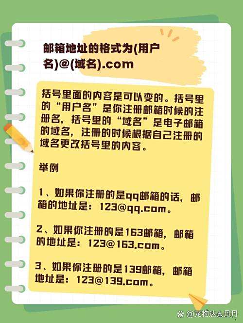 3、电子邮箱的格式通常为用户名@服务器域名其中,“用户名”是你在注册邮箱时所填写的个人名称或系统随机生成的名称,“@”是电子邮箱的固定符号,代表“at”,“服务器域名”则是电子邮箱服务提供商的域名,如邮箱的域名是com二如何填写个人电子邮箱 确定邮箱服务提供商首先,你需要确定自己。