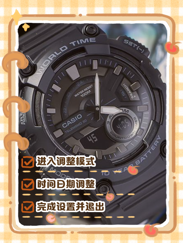 调节卡西欧电子表的时间可以按照以下步骤进行1 找到表冠表冠通常位于表的右侧它是一个带有凸起的旋钮2 拉出表冠轻轻地拉出表冠,直到能够转动3 调节小时和分钟根据需要,逆时针或顺时针旋转表冠来调整小时和分钟4 调准日期和星期如果表上有日期和星期显示功能,可以继续向前。