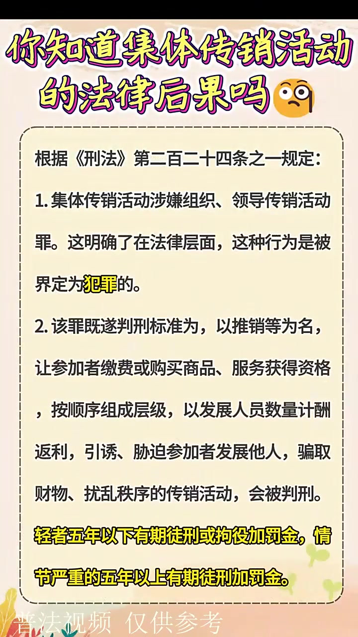 根据相关法律法规,对于组织领导实施传销行为的组织,如情节严重,将面临三年以下有期徒刑或拘役,并处以罚金如果情况特别严重,刑期则可能提升至三年以上七年以下,并同时处以罚金对于参加传销活动的普通人员,并不会按照非法经营罪进行处理本罪主要针对的是带头分子主要成员等关键角色;一组织领导的参与传销活动人员累计达一百二十人以上的二直接或者间接收取参与传销活动人员缴纳的传销资金数额累计达二百五十万元以上的三曾因组织领导传销活动受过刑事处罚,或者一年以内因组织领导传销活动受过行政处罚,又直接或者间接发展参与传销活动人员累计达六十人以上的四造成参与传;将金钱置于首位,眼中只有利益二他们可能会把传销当作一种创业途径,不断地寻找下家,试图说服他人加入,以实现所谓的“共同致富”三在追求财富的过程中,有些人可能会逐渐丧失理智,过度痴迷于金钱,甚至走向疯狂四传销活动涉及非法行为,参与者可能会面临法律制裁,包括入狱坐牢的风险;搞传销被抓后,如果是受害者,警方会进行批评教警方会进行批评教育,如果是策划者,有可能会判刑如果是策划者,有可能会判刑。
