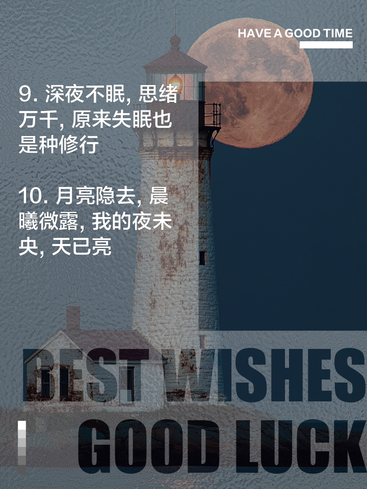 所以不用想着和谁比,你有你疲惫的追求,我有我平凡的快乐没必要盯着别人的生活,自怨自艾,更不要看着别人的幸福,迷失自己生命只有一次,或长或短,感情只有一回,或喜或悲谁都无法预知,每一步路都需要自己去体会谁都不能强求,我们只能学着去接受和面对做一个知足常乐的人,这辈子;”用“黑暗”与“思绪”的对比,强化孤独感 bull“寂静深夜,我与失眠撞了个满怀”将失眠拟人化,增加画面感 2 日常共鸣型短句 语言更贴近生活,适合希望表达无奈或幽默的年轻人例如 bull“夜深了,梦没来,失眠却准时赴约”用“赴约”调侃失眠的规律性 bull。