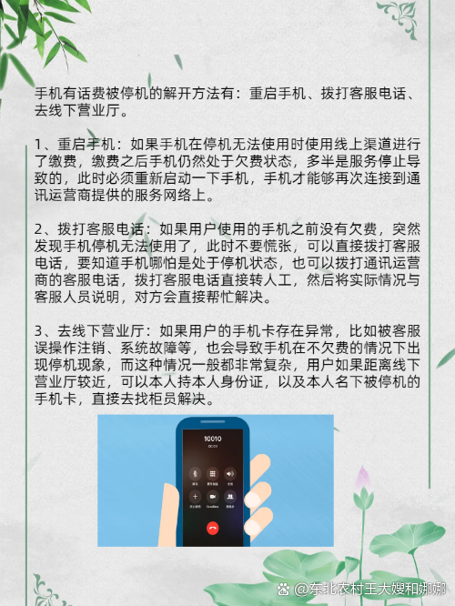 携带身份证到营业厅更换新卡,原号码和套餐可保留其他情况若以上方法无效,建议直接前往运营商营业厅或联系人工客服,提供手机号和身份证信息进一步排查处理同时,为预防停机,可定期通过运营商APP查询余额和套餐状态,开通自动缴费功能,遵守运营商规定,妥善保管SIM卡和身份信息。