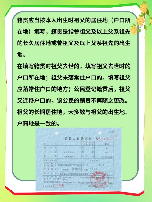 籍贯和户口所在地不一样首先,从定义上来看籍贯是指祖父及以上父系祖先的长久居住地或祖父及以上父系祖先的出生地它是一个相对固定的概念,代表的是一个人的家族根源和历史背景,通常不会因为个人居住地的变化而改变户口所在地是指户籍登记所在地,也就是个人当前在户口薄上登记的居住地址。