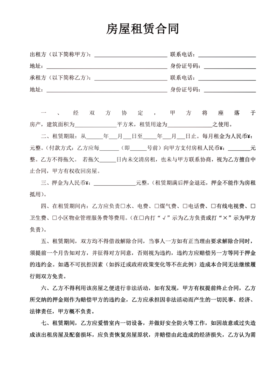 出租方甲方___性别___年___月___日出生承租方乙方___性别___年___月___日出生,身份证号码___甲乙双方就房屋租赁事宜,达成如下协议一甲方将位于___市___街道___小区___号楼号的房屋出租给乙方居住使用,租赁期限自___年___月___日至___年___月___。