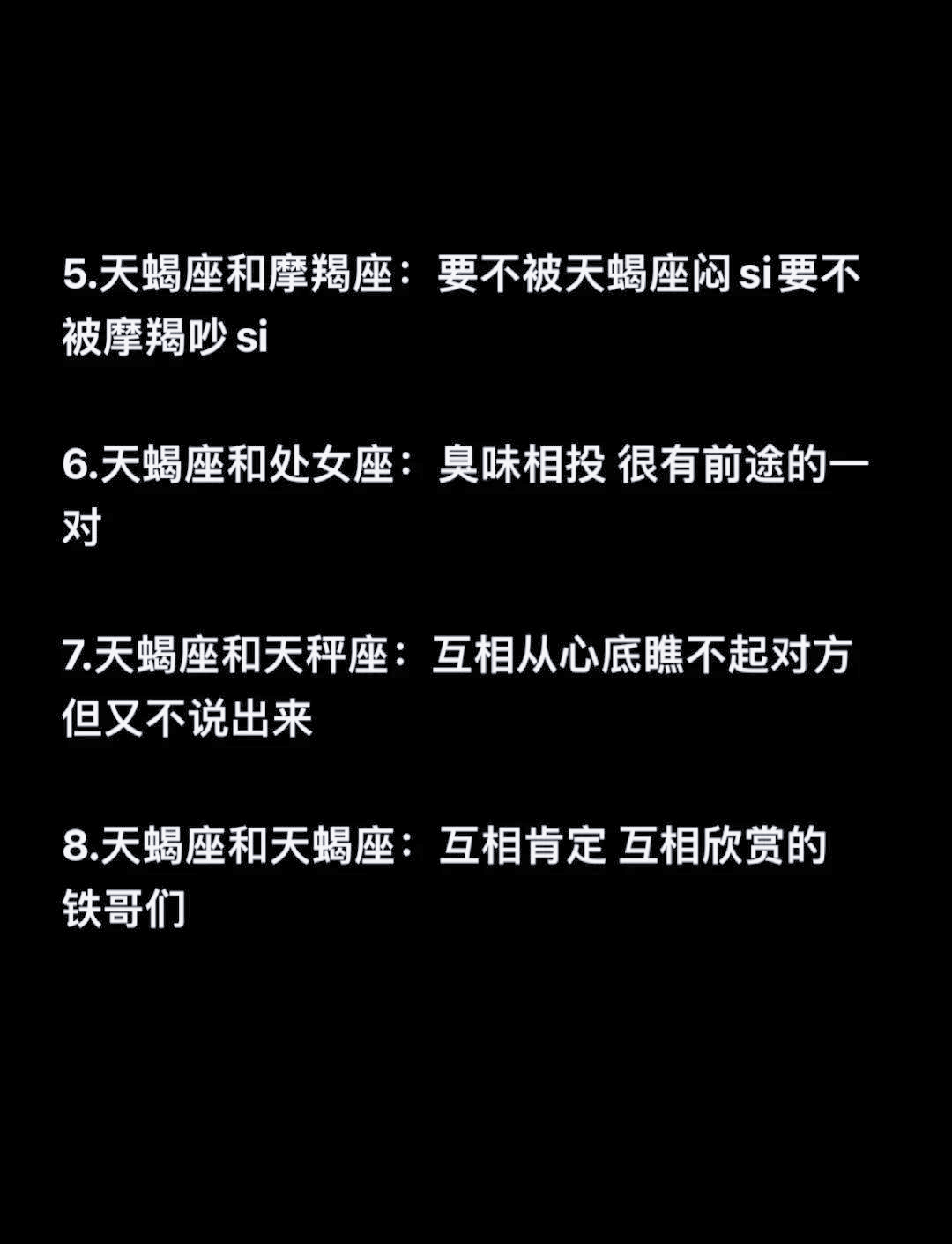 以毒攻毒虽然天蝎座的人有时可能显得过于敏感或占有欲强,但两个天蝎座的人在一起时,这种特质可能会相互抵消他们能够理解彼此的复杂情感,并以一种独特的方式相互支持和包容建议谨慎相处尽管两个天蝎座的人在一起有很多优点,但也需要谨慎相处他们之间的情感火花可能过于强烈,如果不加以控制;1 天蝎座之间的相似性往往意味着他们可能在情感关系中找到共鸣,这为他们的相处奠定了基础2 两个天蝎座的个体通常都拥有强烈的意志和显著的特性,这些相似之处可能成为彼此吸引的源泉,并在共同目标上发挥合力3 天蝎座的人以深情和忠诚著称,他们的关系往往建立在坚实的情感基石上,这有助于确保;爱恨分明天蝎座的人对爱情的态度非常明确,他们爱得深沉,恨得也彻底两个天蝎座的人在一起,能够共同经历爱情的甜蜜和痛苦,相互扶持,共同成长建议自然发展虽然两个天蝎座的人在一起很般配,但也要注意不要过于急进建议他们以比较自然的方式交往,从朋友开始,逐渐深入了解对方这样不仅可以;天蝎座是比较好的一个伴侣,因为他们挺懂得照顾别人,也很懂得保护对方但是两个天蝎座在一起就未必了,因为太了解对方了,所以反而更加容易产生矛盾那么今天就让我们一起来分析看看,十二星座中的天蝎座跟天蝎座在一起,结果会怎么样呢一起玩游戏天蝎男跟天蝎女是兴趣都特别广泛的那种人,而且他们。