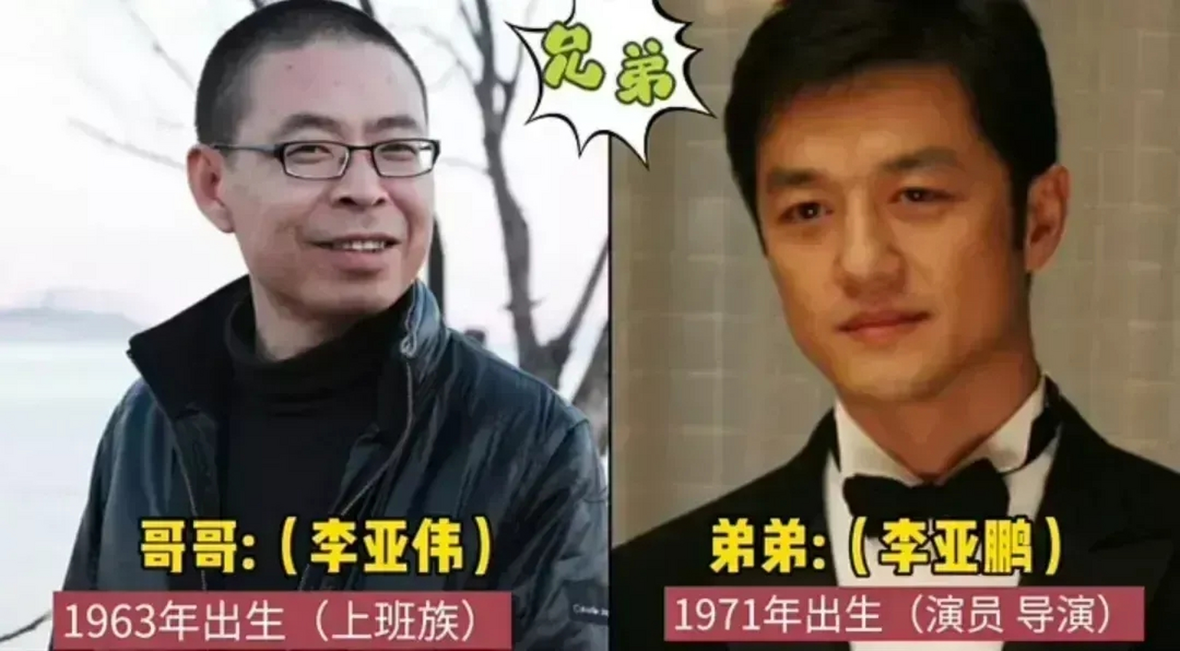 杨志刚与导演郭靖宇是同父同母的亲兄弟1978年,杨志刚出生于河北承德他是家里最小的孩子,上面还有三个哥哥,郭靖宇大他4岁,是他三哥不过出生后两个月,杨志刚就被过继给了舅舅,也就跟随舅舅姓了杨亲生父母,则变成了他的姑父姑妈杨志刚能够走上演艺之路一半的功劳,都要归功于他的哥哥。