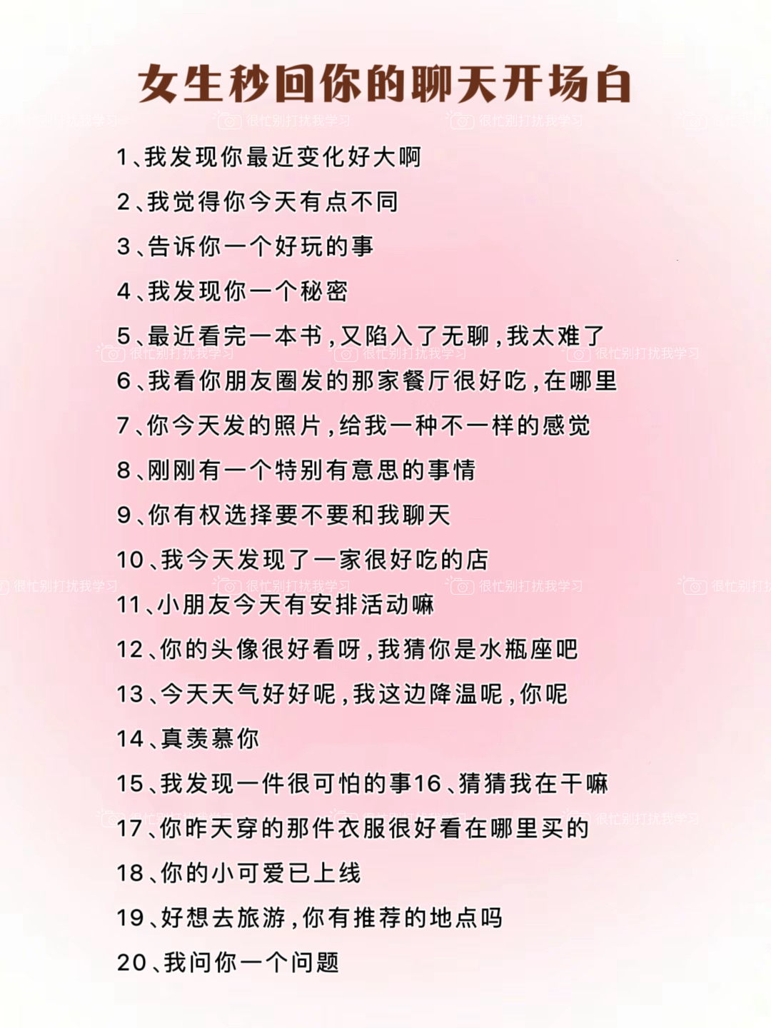 核心结论自然开场+共鸣话题+轻幽默调节氛围,是打开对话的关键若想让聊天不显刻意,优先从共同兴趣或近期动态切入比如对方朋友圈晒过宠物,可以说“刚才路过宠物店,看到一只小猫和你家主子简直双胞胎,瞬间想起你上次说它挑食的故事”,既关联生活细节又引出话题若刚看过她推荐的电影,可以问;在微信上和女孩聊天的开场白,可以尝试以下几种方式1 表情开场 使用一个有趣或友好的表情符号作为开场,这能够迅速打破常规,引起对方的共鸣,为后续聊天营造轻松氛围2 好奇开场 利用对方的兴趣爱好或星座等信息,制造好奇心例如“hey,金牛少女,听说金牛座的人都很有耐心,是真的吗”或者。
