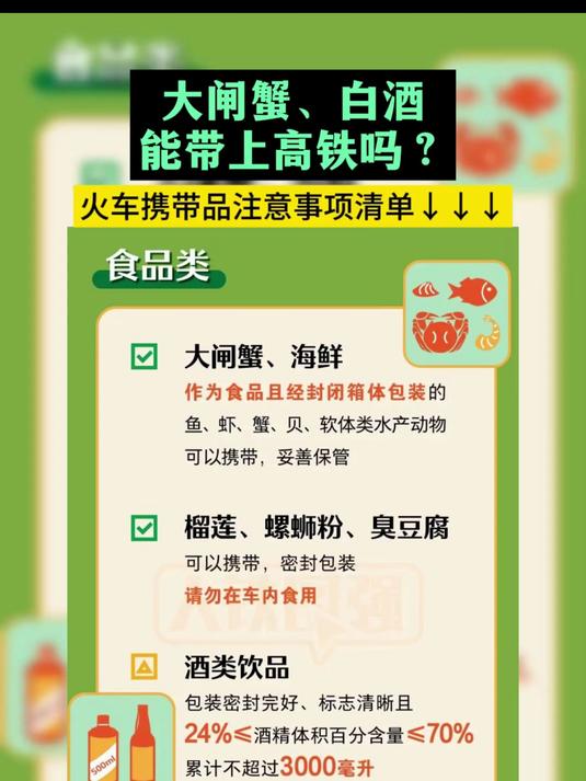 10、火车上不可以带散装白酒关于火车上携带白酒的具体规定,可以从以下几个方面进行详细说明一酒精度限制 火车上允许携带的白酒酒精度有一定范围,但散装白酒由于其酒精度不明确且往往较高,通常被视为易燃易爆物品根据相关规定,散装白酒因其潜在的安全风险,被明确禁止携带上车二包装类型要求 火车。
