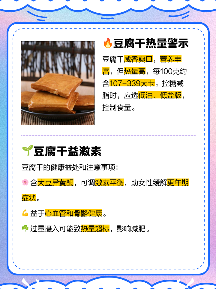 一份100克豆干的热量是140大卡以下是关于豆干热量的 具体热量值每100克豆干的热量为140大卡,或者换算成千焦为585千焦热量占比每100克豆干的热量约占中国营养学会推荐的普通成年人保持健康每天所需摄入总热量的6%热量是热力系统与外界之间依靠温差传递的能量,是人体生命活动所需的重要能量来源;例如,一顿饭中同时食用豆腐干和炸鸡,即使豆腐干本身热量低,整体摄入仍可能超过每日需求健康建议控制摄入量每日建议食用50100克豆腐干,避免因钠或热量累积影响体重选择低盐产品优先购买未添加过多调味料的原味豆腐干,减少钠摄入搭配均衡饮食将豆腐干作为蛋白质来源之一,与蔬菜全谷物等。