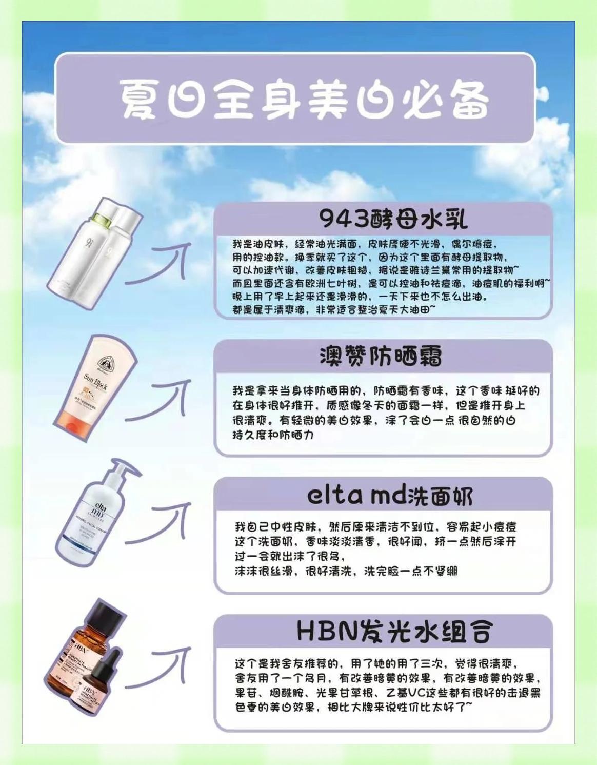 使用磨砂膏和身体乳磨砂膏可以去除皮肤的老废角质,搭配含有烟酰胺熊果苷的身体乳,可以边变白边滋润皮肤例如,法琳泉乳木果身体磨砂膏和丽尔舒果木滋养水感身体乳,两者搭配使用可以使全身皮肤变得更加滑嫩细腻,包括关节和臀部等容易暗沉的部位四口腔护理 使用牙粉刷牙含有薄荷成分和美白成分;1作为学生,应尽量避免在强烈阳光下长时间曝露,以减少紫外线对皮肤的伤害,这不仅有助于肌肤变白,还能预防皮肤问题2学生生活中较少有应酬,因此减少了烟酒等对皮肤的不良影响选择健康饮食,如补充微量元素,减少碳酸饮料和垃圾食品的摄入,多食用新鲜水果蔬菜,这些都有助于皮肤健康3保持规律。