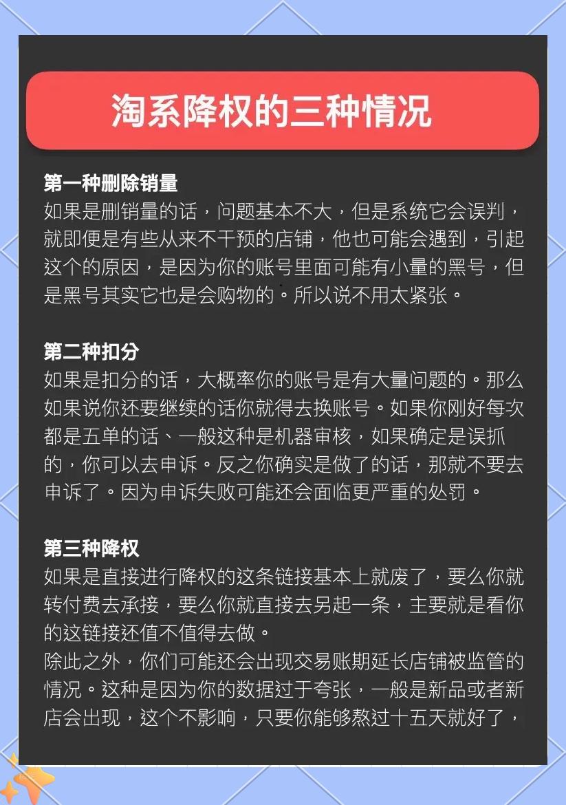 信誉度降低降权账号在淘宝平台上的信誉度会受到影响,可能导致其他卖家或买家对该账号的信任度降低交易限制降权账号在进行交易时可能会受到一定的限制,例如无法参与某些促销活动或享受某些优惠风险增加这些账号在再次参与刷单或其他违规行为时,会有更大的可能性被淘宝平台查处,从而面临更严重的。