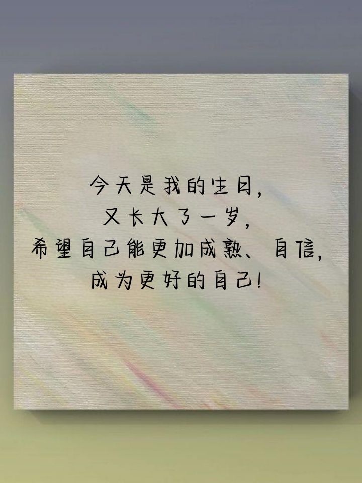 简单的说一句祝自己生日快乐,承蒙时光不弃,感谢一切给予 快乐像阳光,像雨露,播撒在世界的每一个角落像清风,像雾岚,萦绕在我们身边快乐无处不在祝自己生日快乐 愿我们永远敢爱敢恨,活的简单勇敢坚定纯粹,像个少年愿明年今日不会辜负此时的心意 岁月是场有去无回的旅行,好的坏。