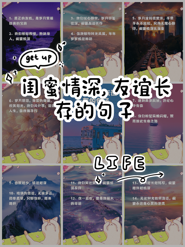1、关于友情的唯美短句1友谊的终结,往往始于卑鄙与狡诈2青春记忆逐渐复苏,开始回忆起谁是谁的谁3无论未来有多长久,请珍惜共度的每一刻4如果仅以表面来判断,爱情与其说像友谊,不如说像仇恨5工作中遇到困难,朋友的关心眼神也能减轻不少压力6友谊是最圣洁的灵物,她既能在;1 深情厚谊 缘分不需要理由,默然相念,寂静喜欢 友谊,不离不弃祝福,永存心底感恩,一路有你2 心灵相依 好朋友,不一定手牵手,但一定心里有好朋友,不一定时时见,但一定天天念 即使有一段时间没有联系,友情却仍然保鲜,没有任何陌生的感觉3 患难见真情 别人都走开的时候;关于好朋友的唯美短句,可以总结为以下几点友情的温暖与美好人生的路上,拥有朋友的美好感受如同温暖的阳光,照亮前行的道路友情的关怀如清泉般清澈无瑕,滋润着彼此的心田友情的多样滋味有人说友情的滋味如糖,甜蜜到心,让人沉醉其中也有人说友情的滋味如小草,自然清新,给人以宁静与舒适;关于好朋友的句子唯美超短句一梦总不够漫长,可我需要梦想!二你难过了,你倾诉,他立马安慰逗乐你,这是在乎你的朋友!三感恩生活中的朋友,谢谢你们陪我走过后每一次旅途!四祝小朋友们节日快乐;关于好朋友的唯美短句如下人生的路上,拥有朋友是美好的感受这份情谊如同温暖的阳光,关怀备至,令人心生暖意友情的滋味多样而美好有人说它如糖般甜蜜,有人说它如清泉般清澈无瑕,还有人说它如小草般自然清新美好的友情如同芳香它会引领你走向一个清新的世界,成为永恒的记忆,珍藏于心友;1“朋友一生一起走,那些日子不再有一句话,一辈子”这首歌,在我快乐悲伤失落时,你总会为我唱起,使我倍感温暖谢谢你,有你真好 2quot静静的夜空,群星在闪耀,老师的房间彻夜明亮quot每次听到当我走过老师窗窗前这首歌,我就想起您,我的老师,您的音容笑貌就浮现在我的眼前quot 结尾 1回首成长时光,因为有你,我的;以下是关于友情的唯美走心文案句子缓慢又笨拙的路上,谢谢你们陪我长大这句话表达了对朋友陪伴成长的感激之情,语言简洁而真挚我们的小船不会翻,因为我们坐的宇宙飞船用比喻的方式形容友谊的坚固和远大,富有想象力和创意妈妈说“关系特别好的朋友,离得再远,心里也会想着对方”借妈妈之。