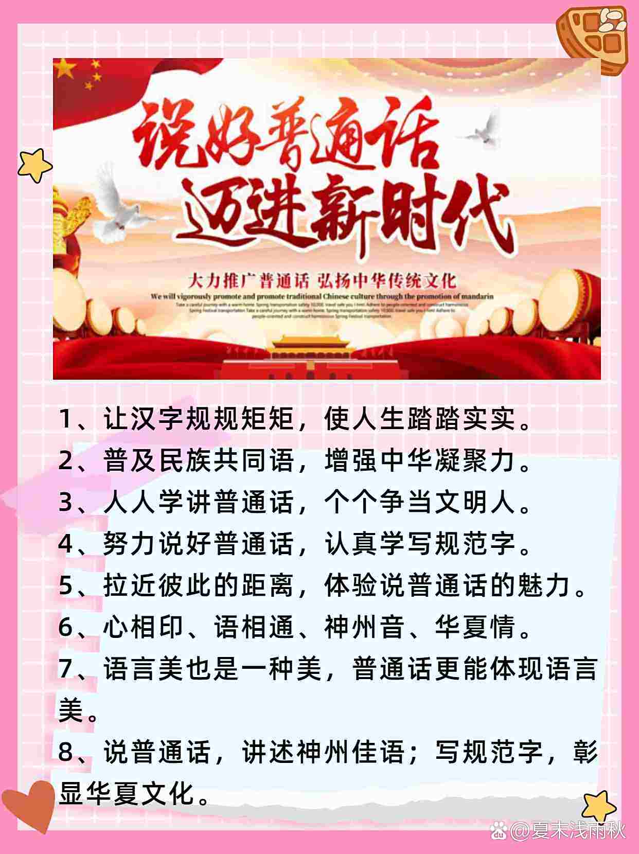 1大力推广和规范使用国家通用语言文字2五湖四海语相通,炎黄子孙心交融3树立语言文字规范意识,构建和谐文明校园环境4普通话同青春携手,文明语和时尚并肩5普通话,沟通的纽带,自信的桥梁手抄报1推广和普及国家通用语言文字,不仅仅是方便沟通促进各民族经济文化交流的需要,而且事关;15炎黄龙文,横竖撇捺,规范书写,四海一家16言规语范着文章,磨言砺行树品德17雅言暖人心,文明传天下18学好普通话,走遍神州都不怕19心相印语相通神州音华夏情20写好方块字,说正普通话,别让老外见笑话21写规范字,创建文明校园22戏说文字,误国害民规范语言,民族一心;一主题标语 普通话,情感的纽带,沟通的桥梁强调普通话在人际交往中的重要作用 心相印,语相通,和谐共处乐融融通过语言相通,促进人与人之间的和谐共处二推广意义 正确使用祖国的语言文字,大力推广普通话明确推广普通话是正确使用祖国语言文字的重要体现 讲普通话,标标准准写规范字。