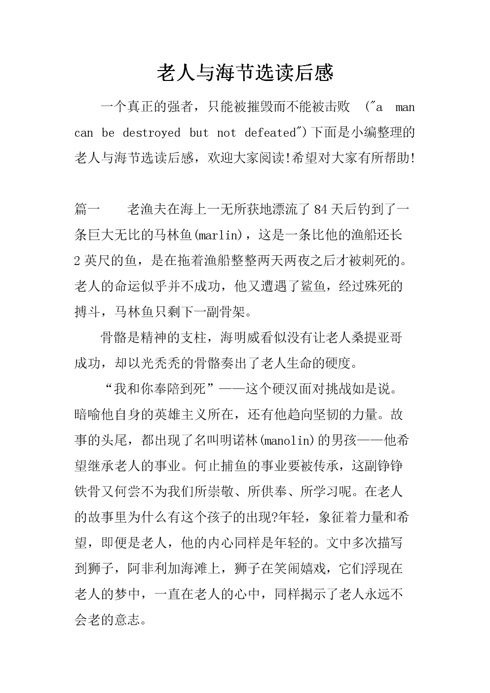 转载请注明来自德立,本文标题:《《老人与海》读后感1000字精选》