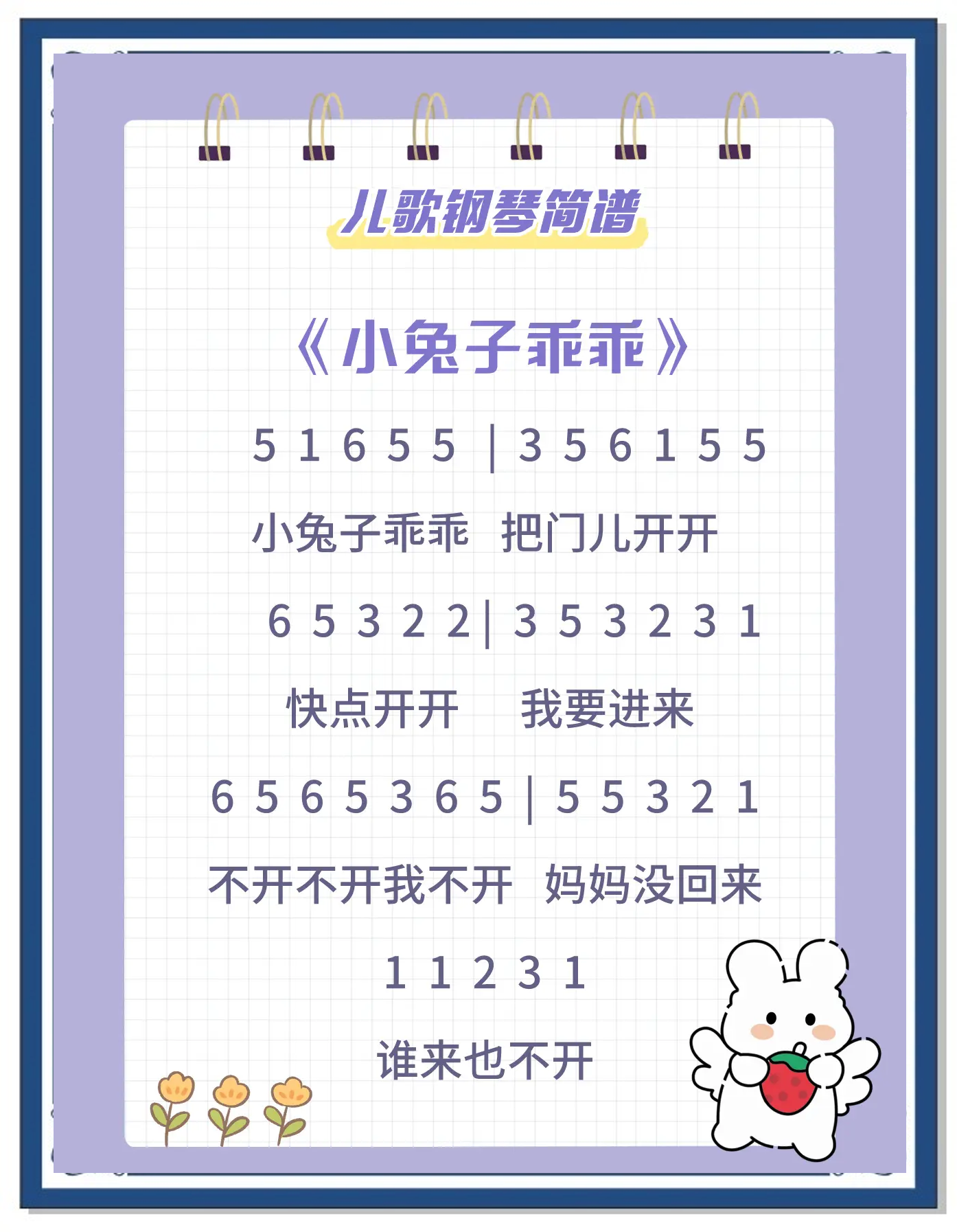 关于小兔子的儿歌有小兔子乖乖小兔子白又白一只小兔子一歌词 1小兔子乖乖歌词兔子乖乖,把门儿开开,让我进来,不开不开我不开,妈妈没回来,谁来也不开小兔子乖乖,把门儿开开,让我进来,就开就开我就开,妈妈回来了,快点把门开2小白兔白又白。