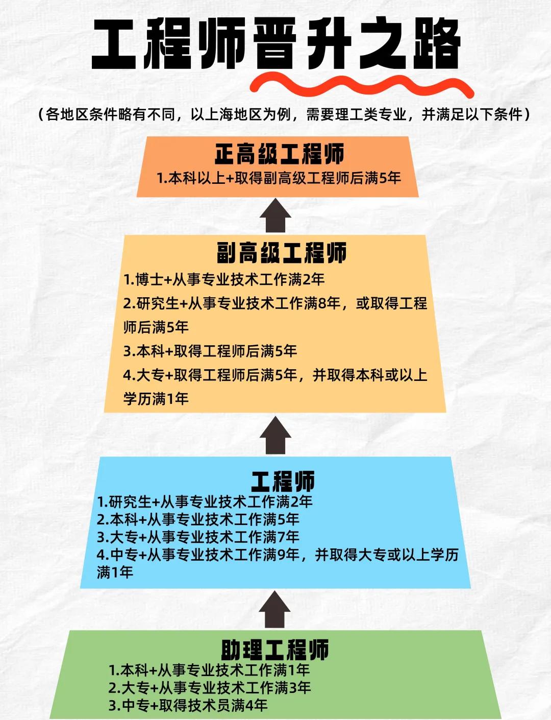 1、初级职称助理工程师学历与工作年限满足其一即可大学本科毕业,从事专业技术工作1年以上大学专科毕业,从事专业技术工作2年以上中专毕业,从事专业技术工作3年以上高中毕业,从事专业技术工作7年以上初中及以下学历,从事专业技术工作10年以上且具备员级职务中级职称工程师学历与工作年限满足其一大学本科。