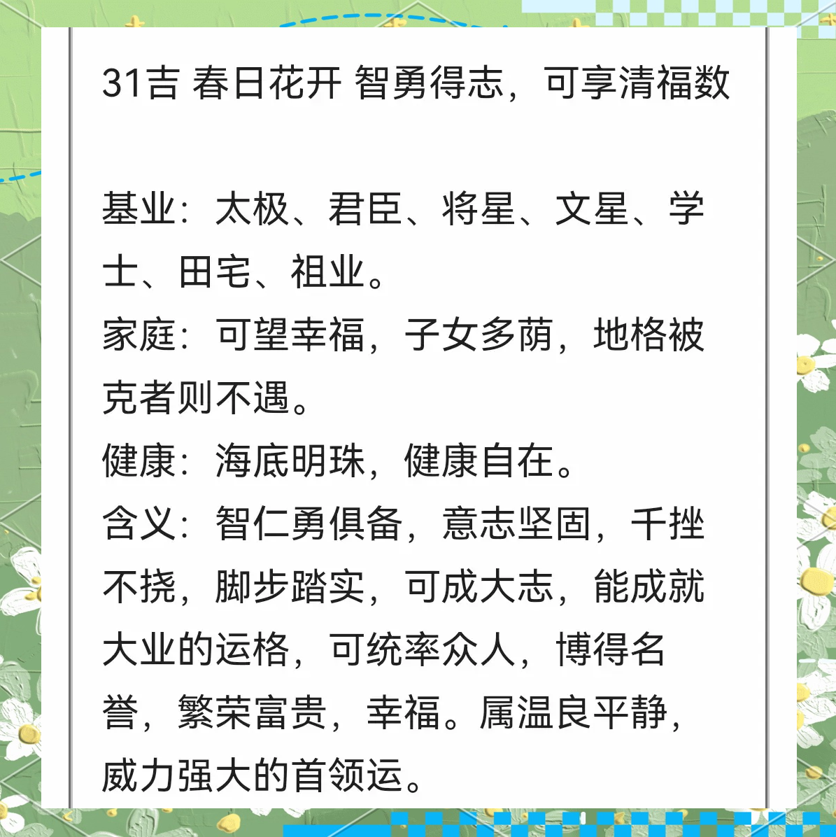 4、男孩温柔文静诗意名字 为男孩起一个温柔文静且富有诗意的名字,能够彰显其独特的气质和风度以下是一些精心挑选的男孩温柔文静诗意名字,供您参考一精选名字 锦荣 理由“锦荣”寓意前程似锦才华横溢,名字低调而好听,同时带有一种内在的霸气感,又不失文静孟延 理由出自“孟夏草木长,绕屋树;两个字家族名 月落寓意着月光洒落,营造出一种静谧而唯美的氛围 蓝缘蓝色象征着宁静与深远,缘则暗示着家族成员间的深厚情谊 清漪清波荡漾,如诗如画,适合喜欢清新风格的家族 琥珀琥珀色温暖而神秘,寓意家族成员间的温暖与默契 紫夜紫色代表高贵与神秘,夜则增添了一丝浪漫与唯美;1 王世德“德”字出自周易“厚德载物”,寓意品德高尚,能包容万物,体现家族对品德传承的重视2 王世铭“铭”有铭记之意,象征家族记忆与文化传承,与“世”字搭配,既有文化底蕴又显庄重3 世博“博”代表博学多才,名字简洁有力,适合重视教育的家庭,且具国际范4 世轩“;烟雨楼中伊人醉描绘了一幅烟雨朦胧伊人醉卧的美丽画面,富有诗意花未落简洁而富有意境,象征着家族的美好与希望枯风静亭带有一种萧瑟与宁静的美感,适合喜欢低调而深沉的玩家倾城如梦?未必阑珊寓意家族的美好如同梦境一般,但未必会消逝,充满神秘感断灵翼莫笑带有一种坚韧与不屈;以下是一些唯美简短且好听的家族名字月落花溪寓意着月光下的花溪,美丽而幽静蓝缘圣殿蓝色代表着神秘与高贵,圣殿则象征着家族的庄严与神圣风起时花落描绘了风起时花瓣飘落的美丽景象,富有诗意清漪清波荡漾,涟漪微动,寓意家族如水面般平静而深邃浩澜轩浩澜象征着广阔的海洋,轩则。