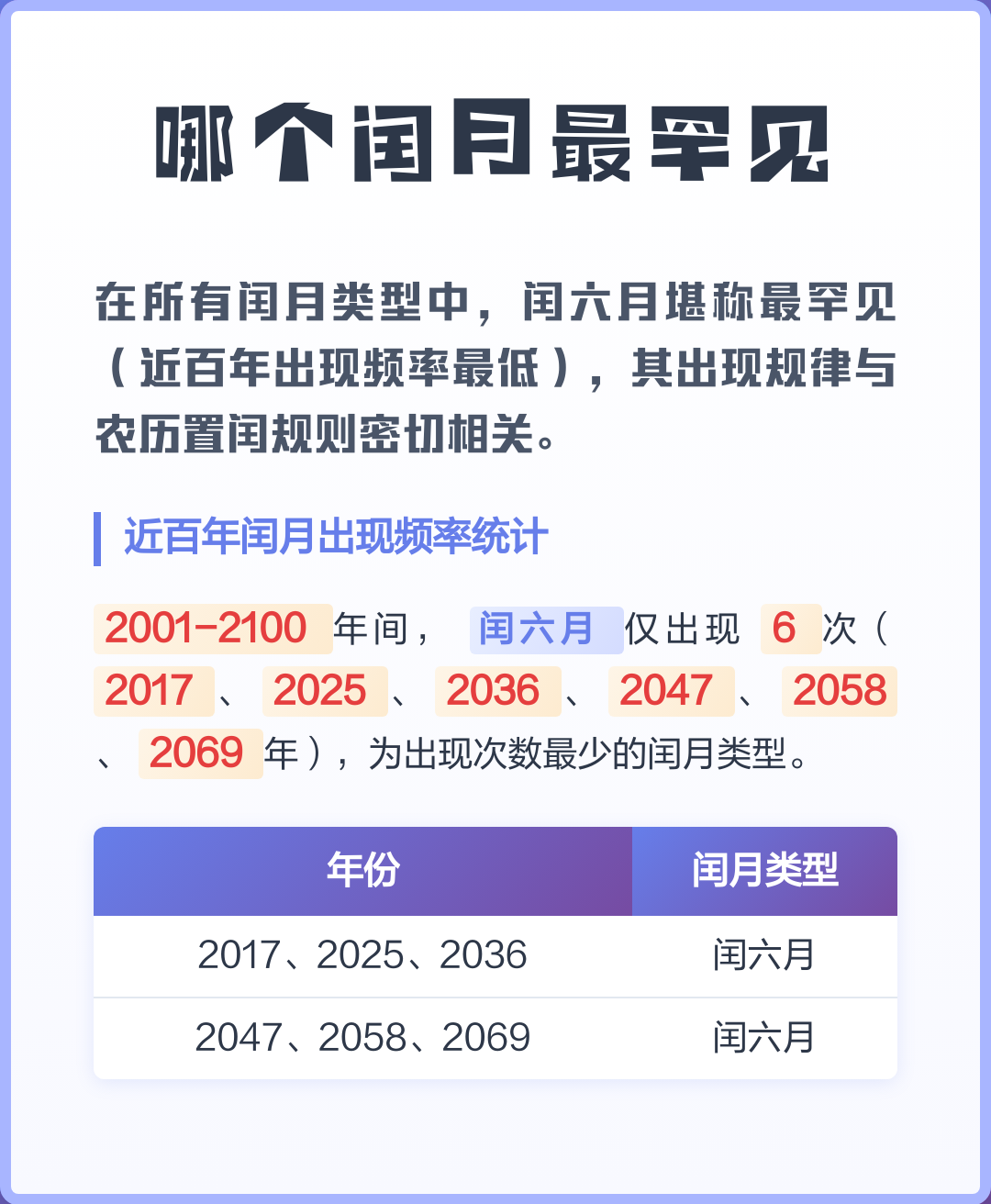 3、18 1995年闰八月 19 1998年闰五月 20 2001年闰四月 21 2004年闰二月 22 2006年闰七月 23 2009年闰五月 24 2012年闰四月 25 2014年闰九月 26 2017年闰六月 27 2020年闰四月 从上表可以得知,闰四月五月六月的次数较多,而闰九月十月则较少,特别是没有闰十一月十二月;1987年闰六月 1990年闰五月 1993年闰三月 1995年闰八月 1998年闰五月 2001年闰四月 2004年闰二月 2006年闰七月 2009年闰五月 2012年闰四月 2014年闰九月 2017年闰六月 2020年闰四月 请注意,每个农历的闰月位置与阳历的年份是对应的,但具体哪一年份的哪个;其次,置闰规则为农历三年一闰,五年两闰,十九年七闰闰月加在某月之后叫ldquo闰某月rdquo,接下去的闰月年份是2009年2012年2014年2017年2020年2023年等需要注意的是,闰月并不是每年都有最后,闰月在历法中的设置是为了使农历年与太阳年相适应,以保持天文历法的准确性。