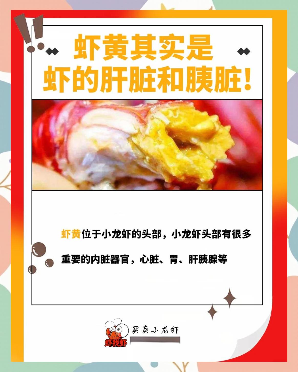 11、虾黄就是虾的性腺,俗称为“黄”,母虾到成熟期,头颈处会含有虾黄,所以有虾黄的虾子一定是母虾,但没有虾黄则不一定是公虾,母虾未成熟也看不到虾黄提醒大家,一定要购买来源正规煮熟的小龙虾,这才能保证美味和健康并存小龙虾“虾黄”不等于蟹黄 “虾黄是由脑心胃,还有消化腺等等器官组成,所以吃的。