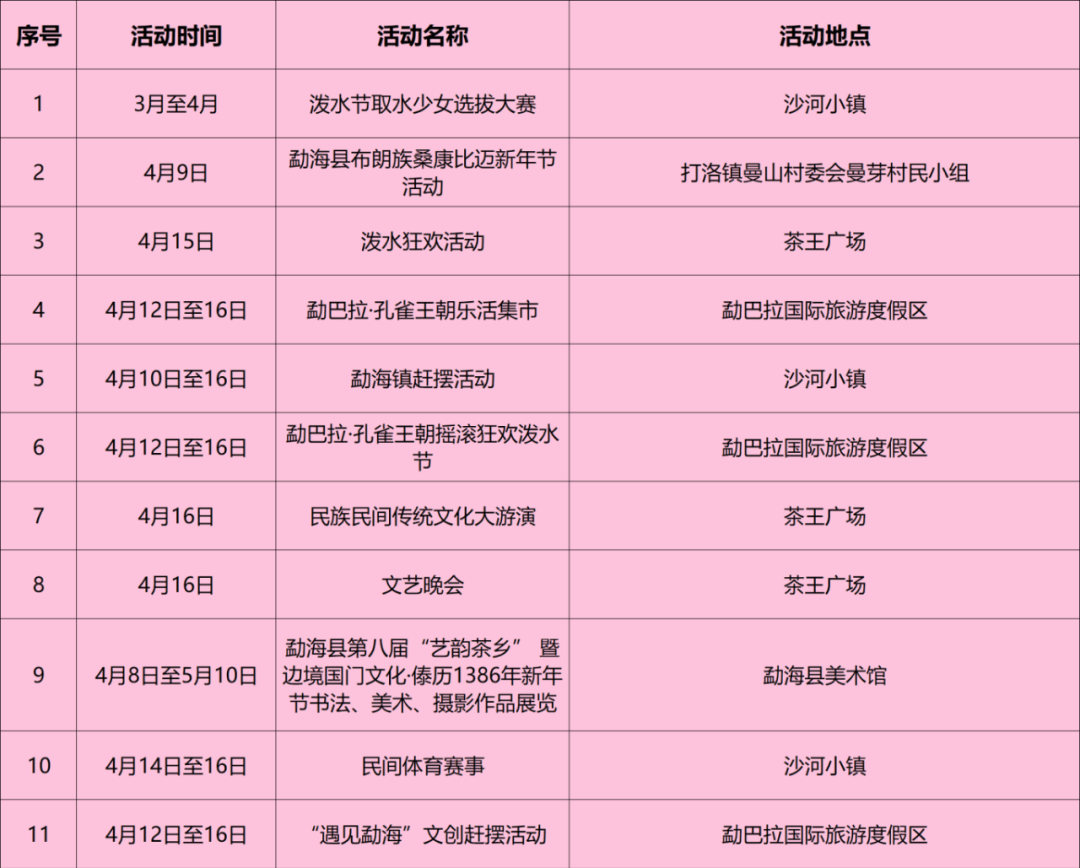 傣族泼水节一般在阳历4月13日至15日举行泼水节,是中国傣族阿昌族布朗族佤族德昂族等少数民族和中南半岛某些民族的新年节日为傣族一年中最盛大的传统节日中国傣族节期在傣历六七月清明节后十日左右现已固定在公历4月13至15日节日期间,人们相互泼水祝福,并举行拜佛赛龙舟放。
