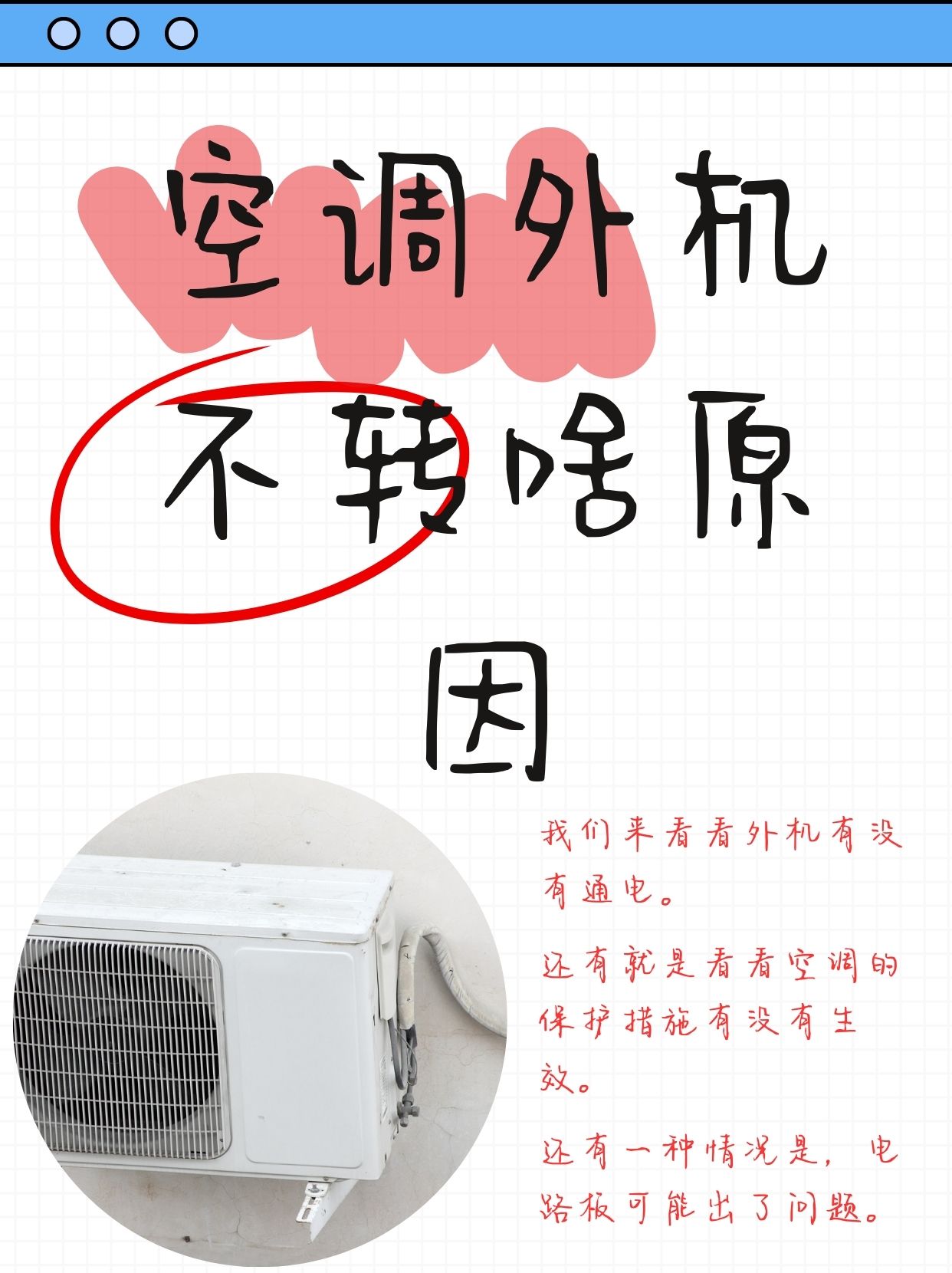 空调外机不转可能有多种原因比如电源问题,外机没电肯定无法运转,可能是插座故障空气开关跳闸或者外机的电路出现断路等还有可能是压缩机故障,压缩机是外机运转的关键部件,它损坏的话外机就无法正常工作,比如压缩机卡缸电机烧毁等情况另外,风扇电机故障也会导致外机不转,风扇不转就无法。