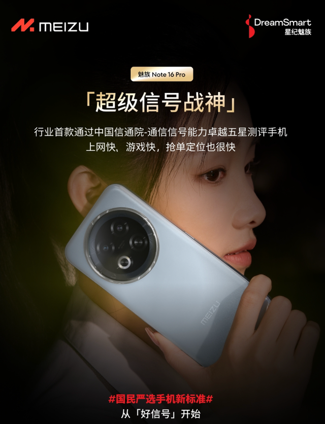 同时,魅族 Note 16 Pro 行业首款通过中国信通院-通信信号能力卓越五星测评手机。无界超级天线系统,配备 19 根超级天线,同档首次引入满血 N28 低频四天线技术方案,实现更广信号覆盖,搭载 mSmart 智选优网 SNS 技术,弱网环境也能稳定连接,抢网更快一步;双天线 Wi - Fi 设计支持双频 2x2 MIMO 技术及分布式布局,网速更快更稳定;双频 GPS + 三频北斗,带来更快更准的定位体验。