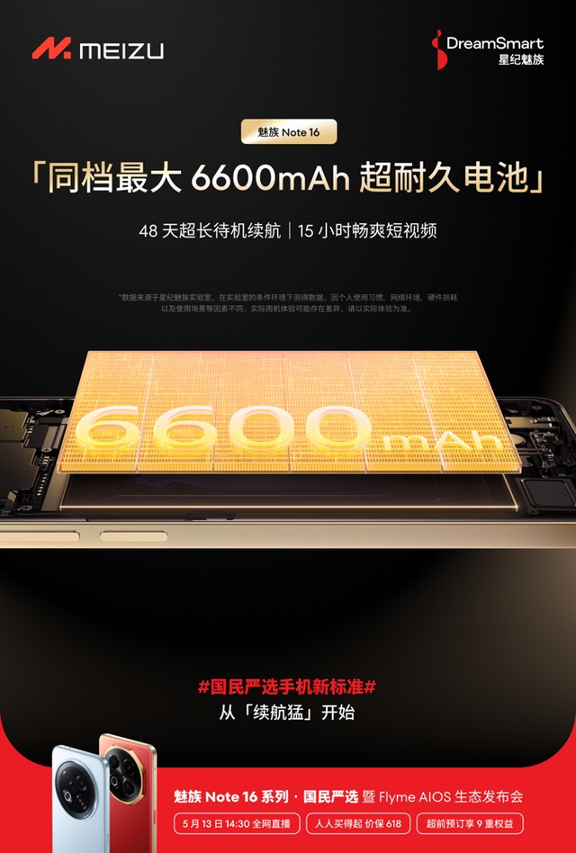 续航能力方面,魅族 Note 16 搭载 6600mAh 超耐久电池,最高可达 48 天超长待机续航,15 小时畅爽短视频,以及更多常见应用续航优化。
