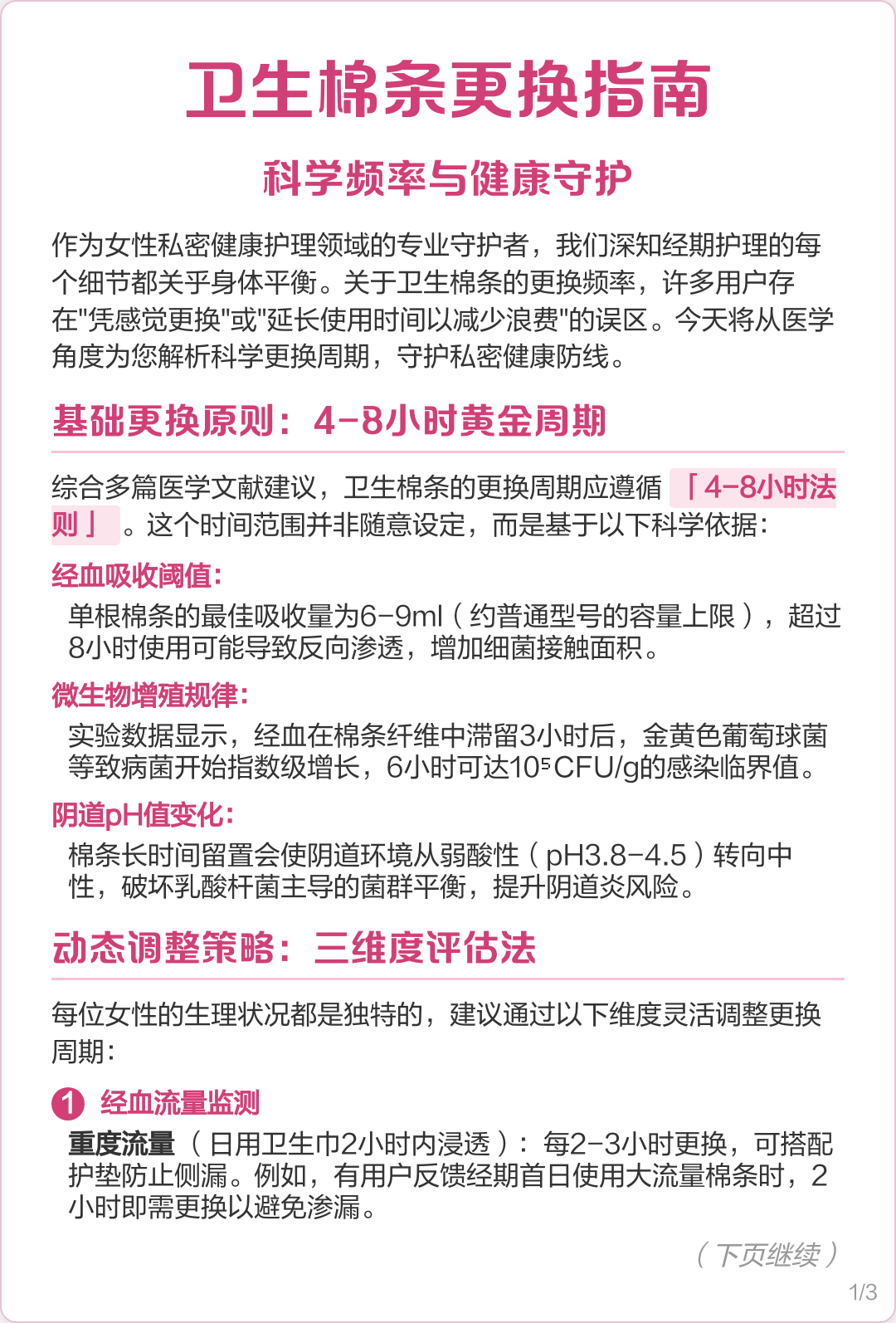 1 卫生棉条几个小时换一次 48小时卫生棉条是需要塞到阴道内使用的,因为阴道的环境十分温暖潮湿,而且经血中也含有较多的蛋白质,非常有利于细菌的生长和繁殖,所以与其它的卫生用品一样,卫生棉条也是需要定时进行更换的,一般为48个小时具体时间建议根据个人流量的大小来决定,对于流量比较;卫生棉条的更换频率取决于月经量经量较少时可以在46个小时更换一次经量较多时最好24个小时更换一次在月经量较多时,使用适用于大量月经的棉条也可能很快被浸透,导致月经血外溢,因此应及时更换注意事项 及时更换为避免月经血外溢,应在卫生棉条全部浸满之前及时更换 避免长时间放置即使月经量减少,使用普通型号的卫生棉条也不应放置;常规更换时间一般建议每隔48小时就更换一次卫生棉条,以确保使用过程中的卫生和安全经血量影响如果经血量较多,建议缩短更换时间,每隔23小时就换一次,以避免漏血情况的发生避免长时间使用长时间使用同一卫生棉条容易滋生细菌,对人体健康造成不利影响因此,务必遵循建议的更换时间,不要超过8小时;虽然卫生棉条最好三个小时就更换一下,最长也不宜超过八个小时,但是如果使用的时间超过了八个小时,也不必太过担忧,立即到厕所更换即可,因为偶尔一次这样并不会对身体产生什么实质性的危害但是如果经常这样忘记将棉条取出,而且出现了阴部瘙痒红肿,甚至发热呕吐腹泻等不适症状,那么建议及时就医;4每4到8小时更换一次卫生棉条 切勿使用单个卫生棉条超过8小时 5使用所需的最低吸水性卫生棉条 如果您在可以不更换卫生棉条的情况下使用一个卫生棉条长达八小时,那么它的吸水性可能太高了 6如果您有疼痛发烧或者其他异常症状,请联系您的医疗保健提供者 如果您在尝试使用卫生棉条时出现不适疼痛感或者其他意外症状,例如异常分泌物或者过敏反映;卫生棉条不能超过几个小时 不建议超过8小时卫生棉条是需要内置入到阴道内使用的,如果使用时间过长的话就会很容易滋生细菌,对人体健康造成不利的影响,所以一般建议最好是每隔48小时就更换一次,最好不要超过8小时具体更换时间建议根据个人的经血量来决定,如果经血量较多的话,那么建议最好是每隔;卫生棉条最好4~6小时内更换一次具体原因如下避免阴道干燥为了安全起见,卫生棉条内置时间不宜过长,以免过于吸收阴道内的水分,导致阴道干燥维持阴道正常环境长时间不更换卫生棉条可能会破坏阴道的正常环境,增加感染的风险保持卫生定期更换卫生棉条可以有效吸收经血,保持私处的清洁卫生因此。